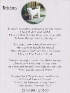 Brittany a former DR resident was adopted by Doreen & Bill Watkins approximately four years ago and after Bill’s passing gave Doreen a lot of pleasurable company and love. Regrettably at 11 years of age, Brittany lost her battle against lymphoma and passed away at 10.50am on Tuesday 4th November 2010. Brittany is now in “Doggie Heaven” with Bill and her good friend Sammy.