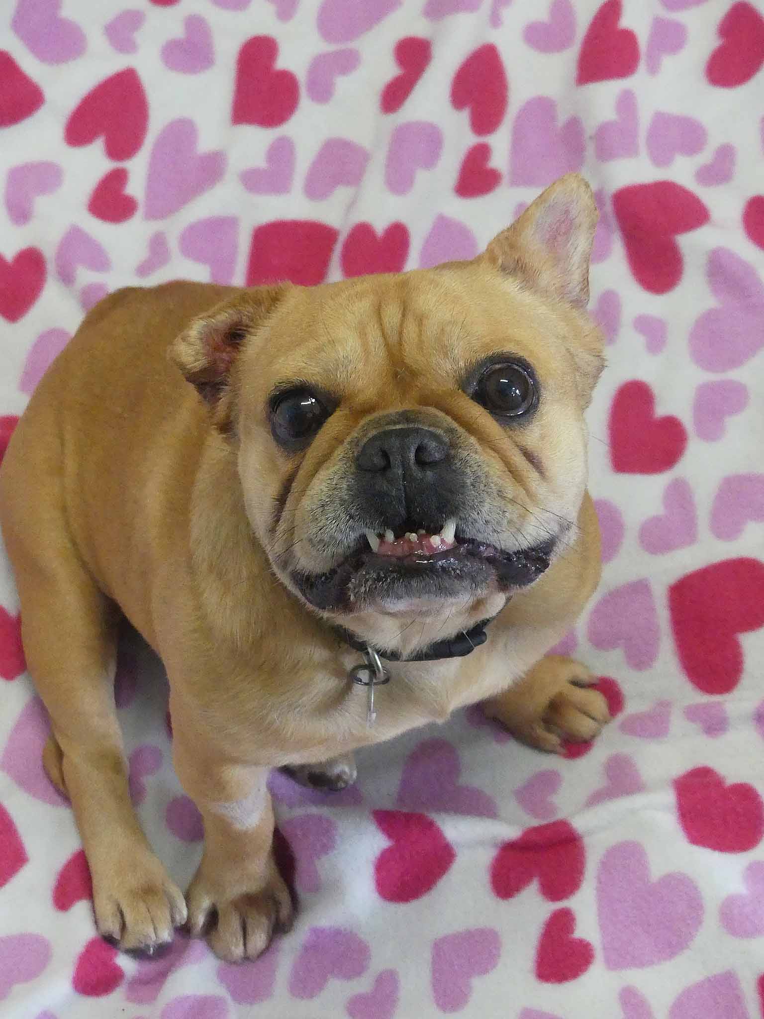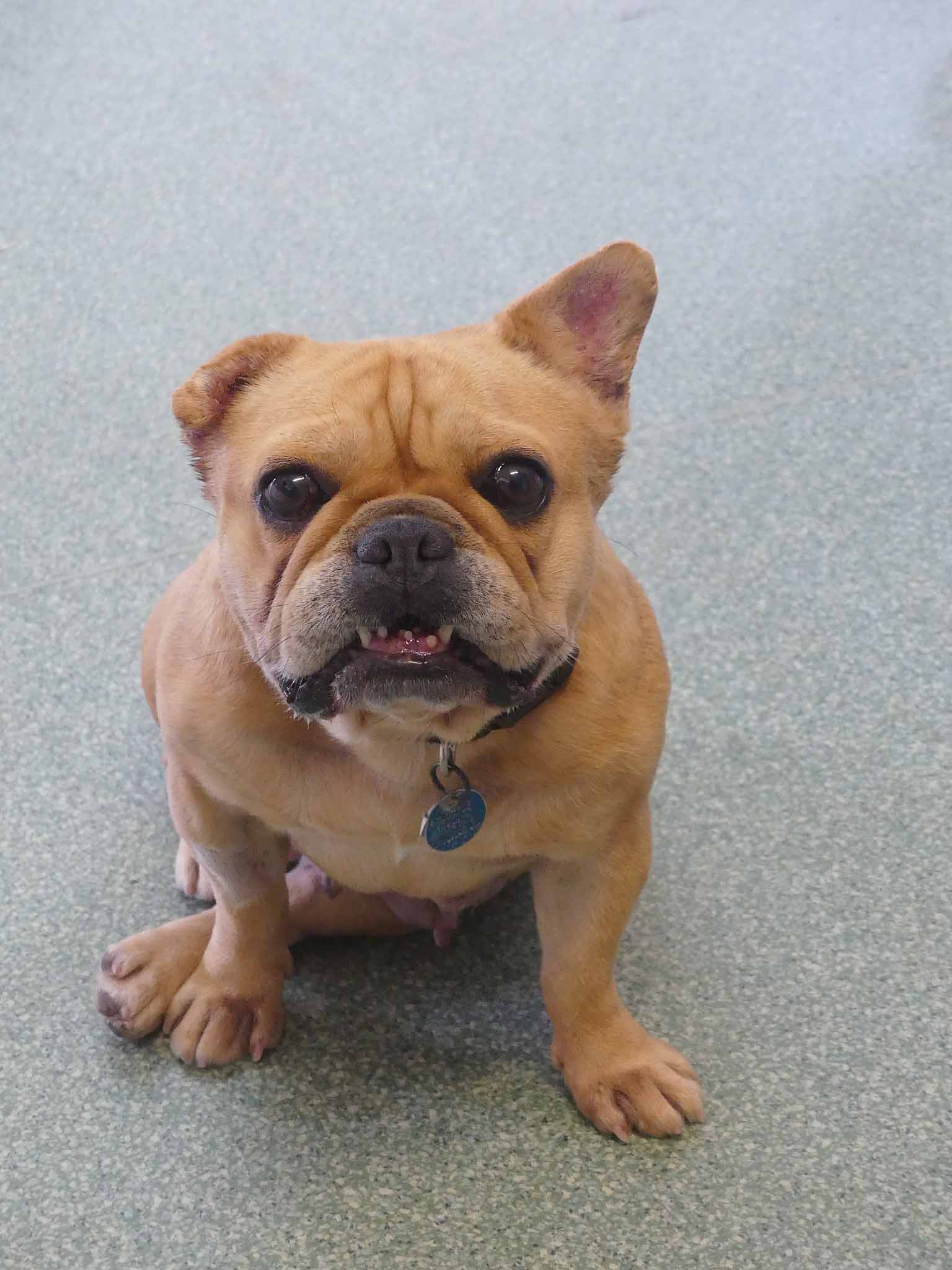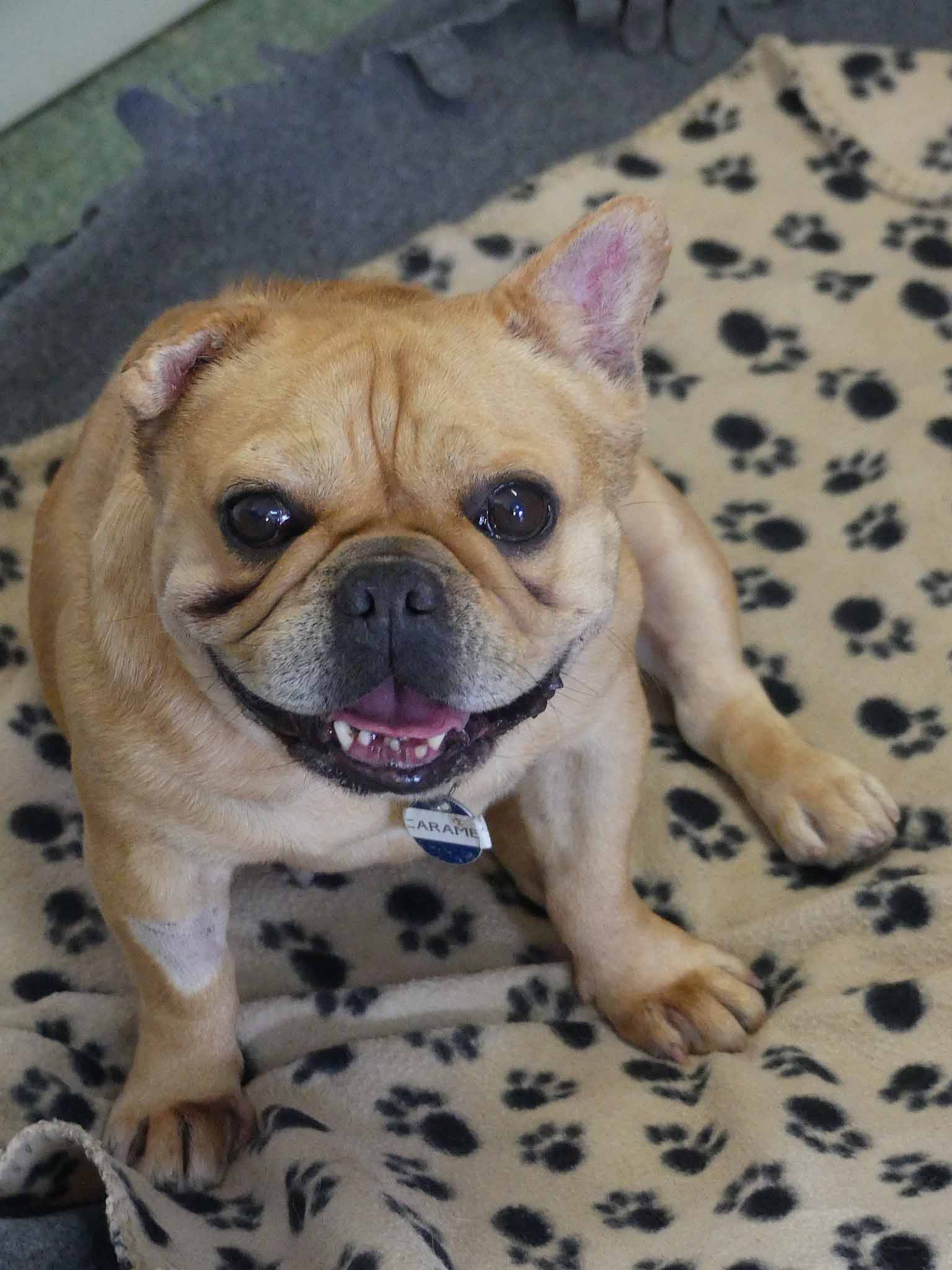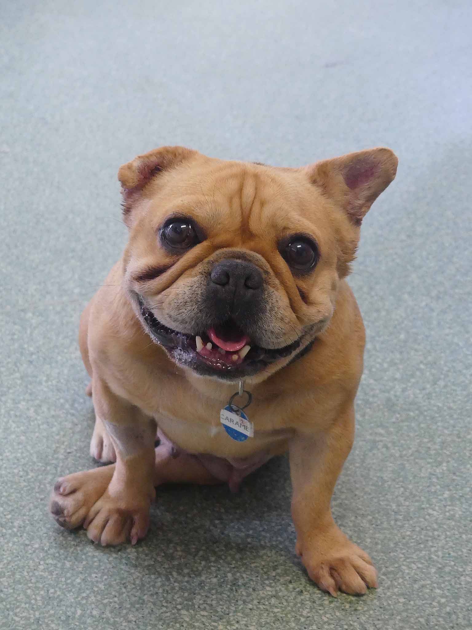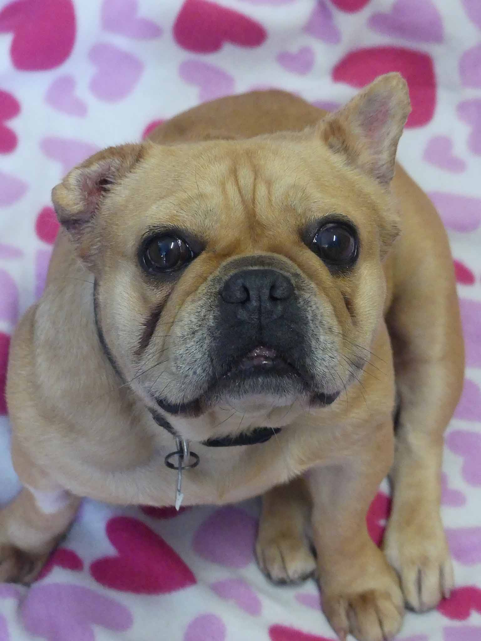 Caramello came from the pound is a neglected state. She is such a sweet loving girl and is social with other small dogs. She has bred many pups in the past. Caramello's right ear is under treatment for infection, and the ear is crinkled from previous infections that have not been treated. She also has some interdigital dermatitis that we are working on to improve her skin. Caramello is a typical Frenchie with medical issues. She has hemivertebrae of abnormal shape that can cause spinal instability and she already cannot walk far. She needs air-conditioning as much as possible and a family who understand her limitations and financially equipped should a medical emergency arise. She has a smooth coat and weighs 10.8kg.
