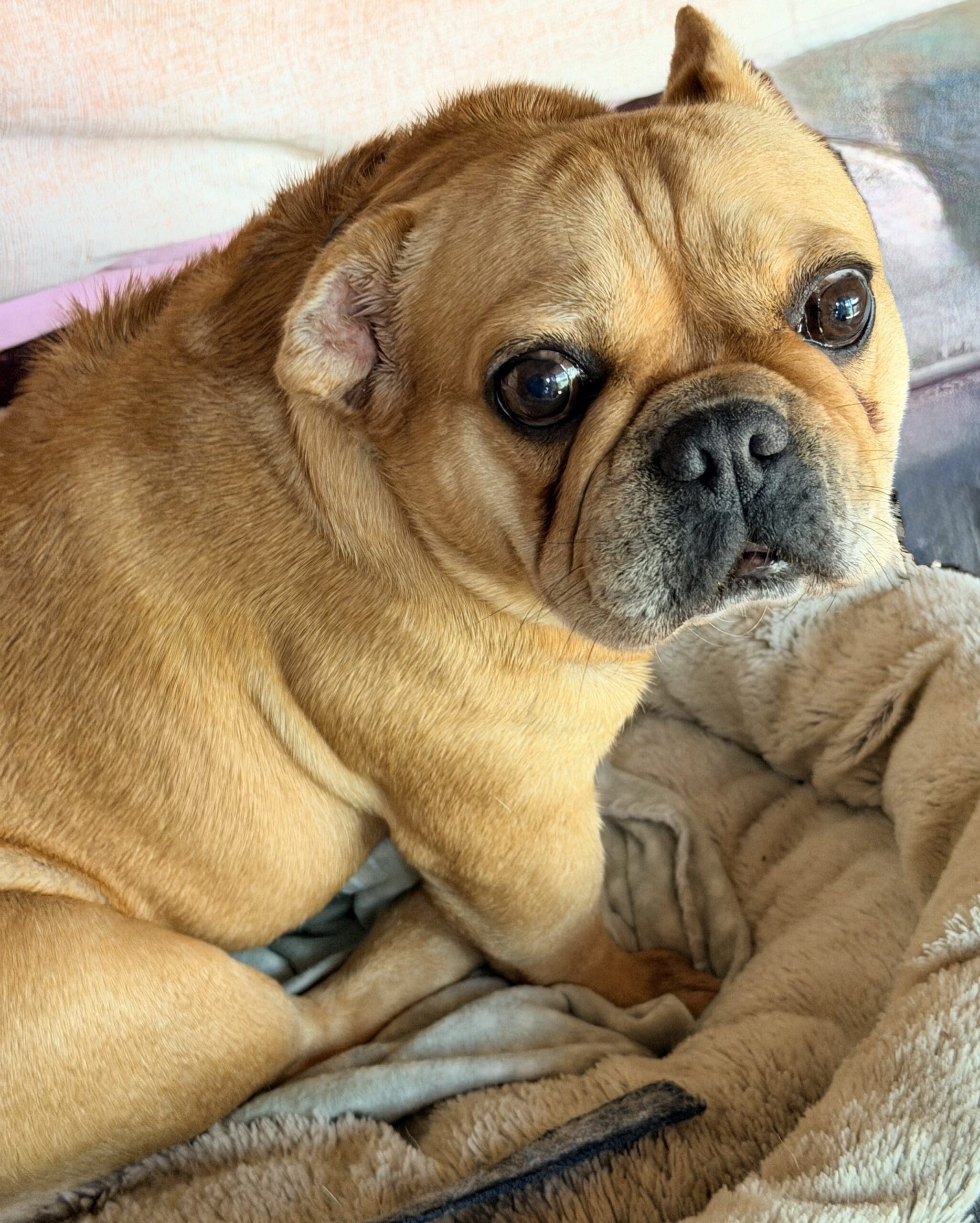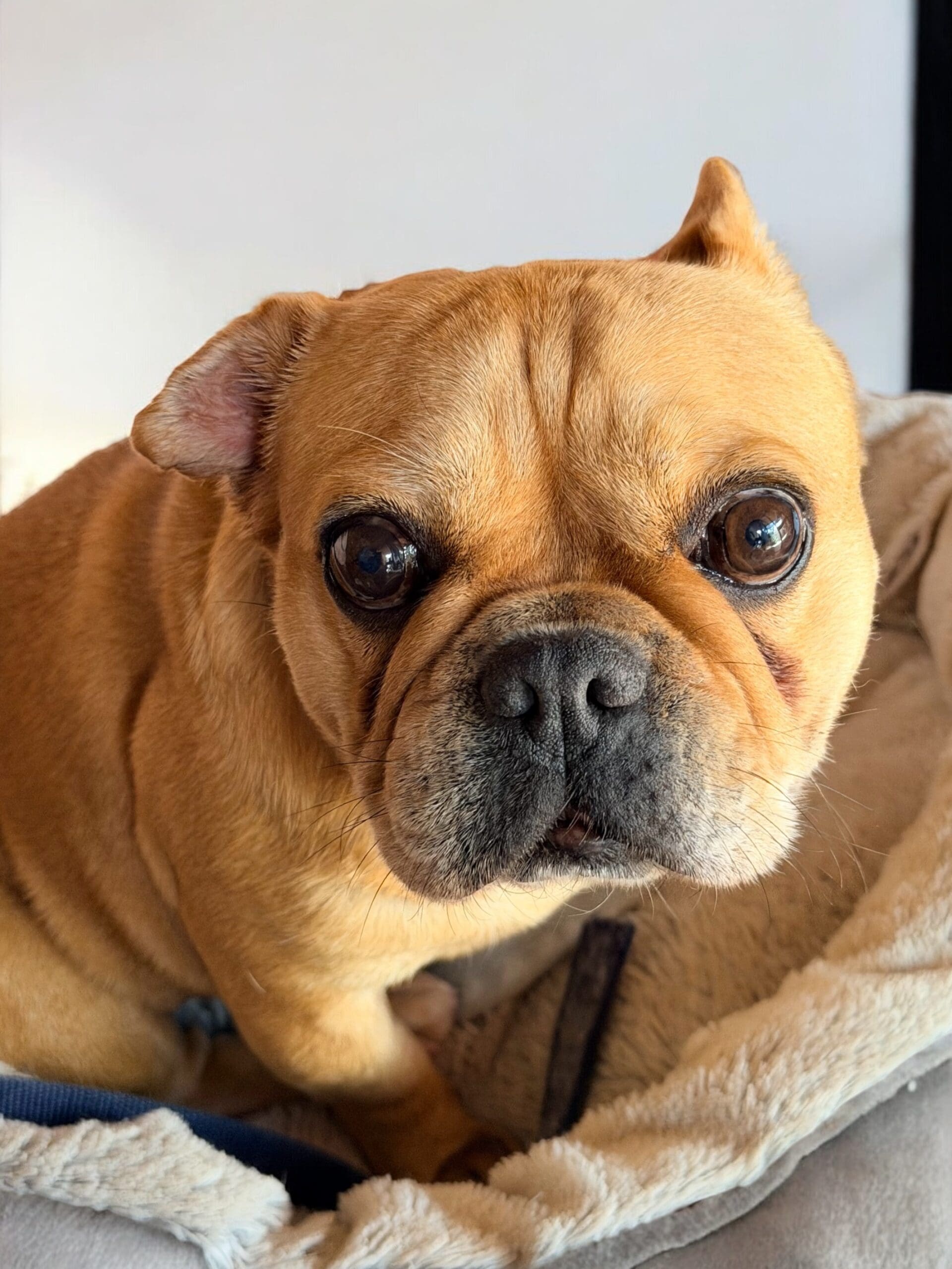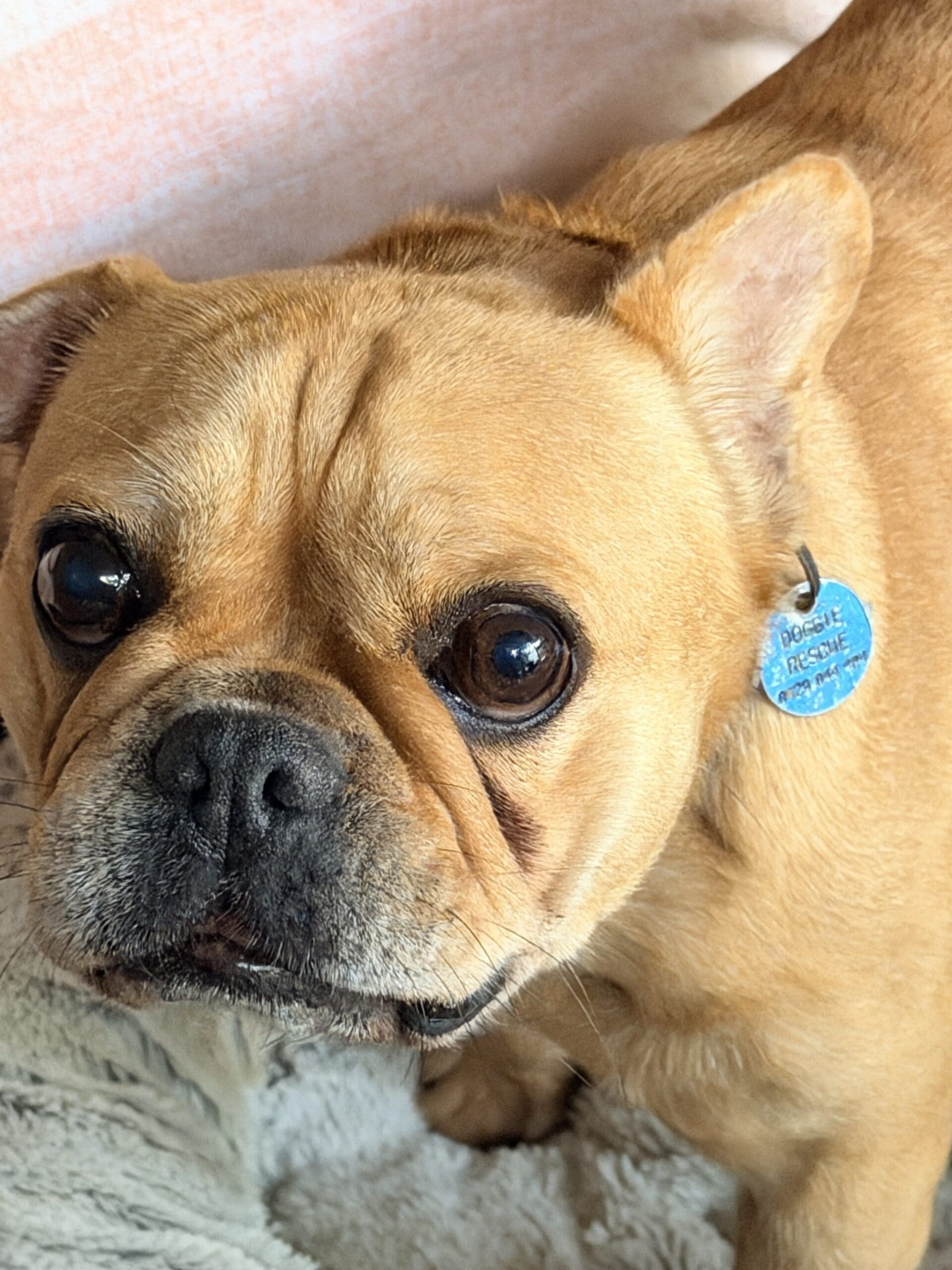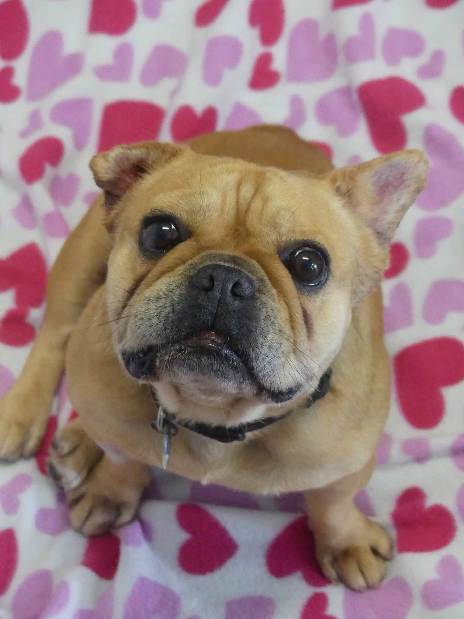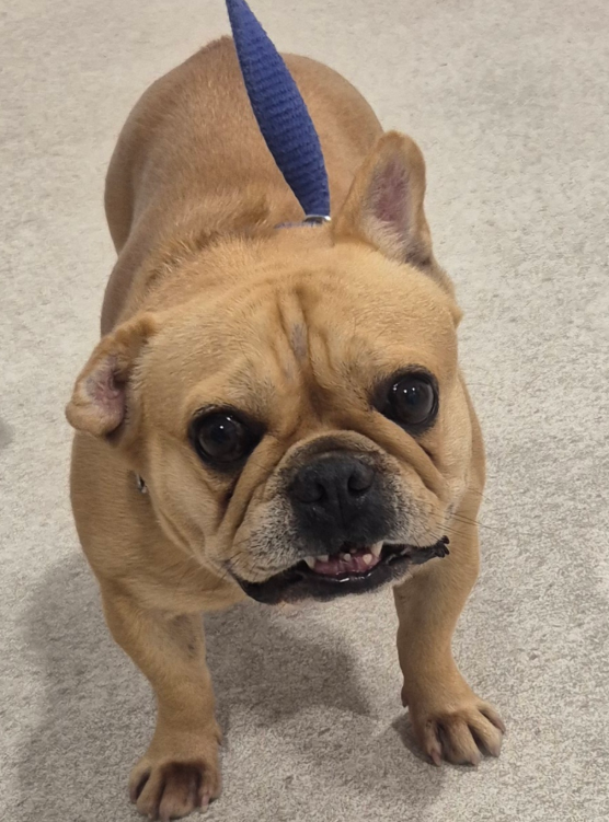 Caramello came from the pound is a neglected state. She is such a sweet loving girl and is social with other small dogs. She has bred many pups in the past. Caramello's right ear is under treatment for infection, and the ear is crinkled from previous infections that have not been treated. She also has some interdigital dermatitis that we are working on to improve her skin. Caramello is a typical Frenchie with medical issues. She has hemivertebrae of abnormal shape that can cause spinal instability and she already cannot walk far. She needs air-conditioning as much as possible and a family who understand her limitations and financially equipped should a medical emergency arise. She has a smooth coat and weighs 10.8kg.