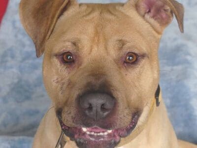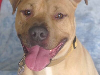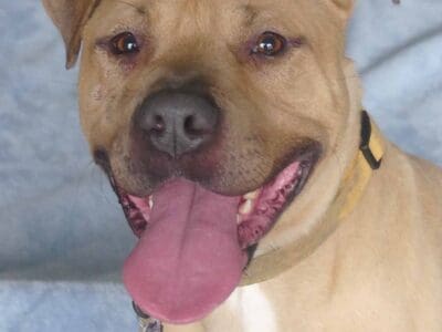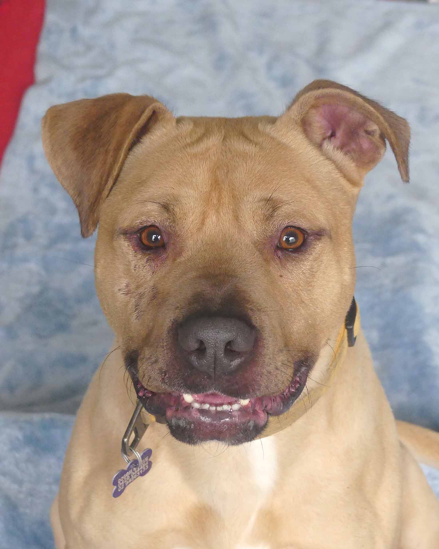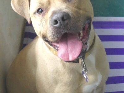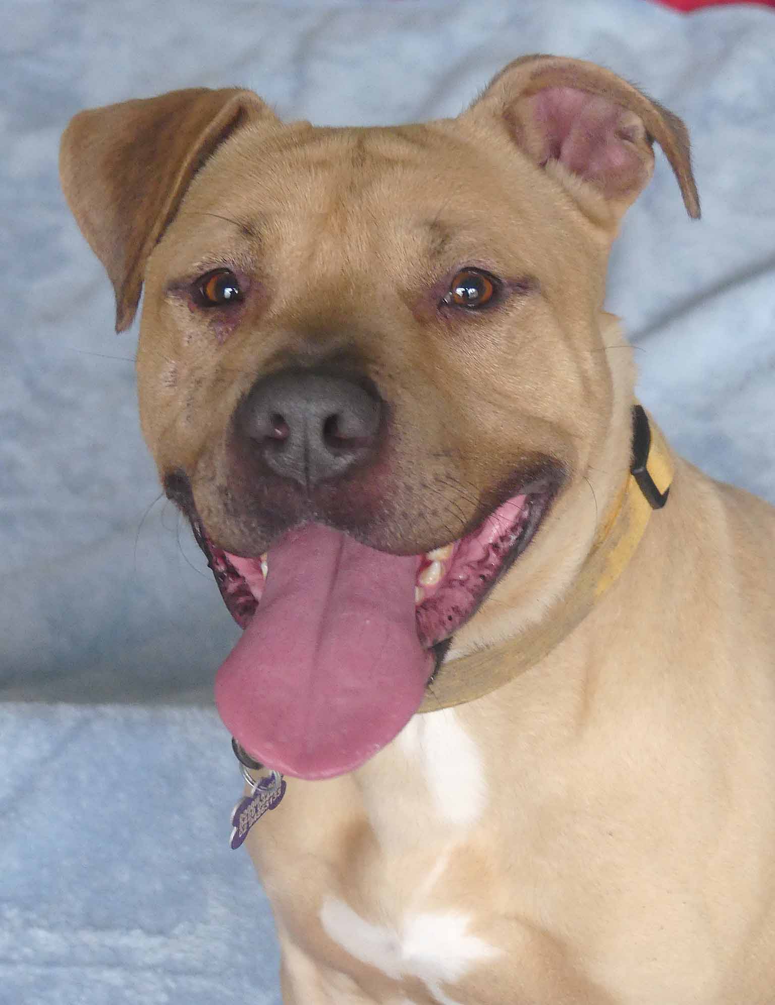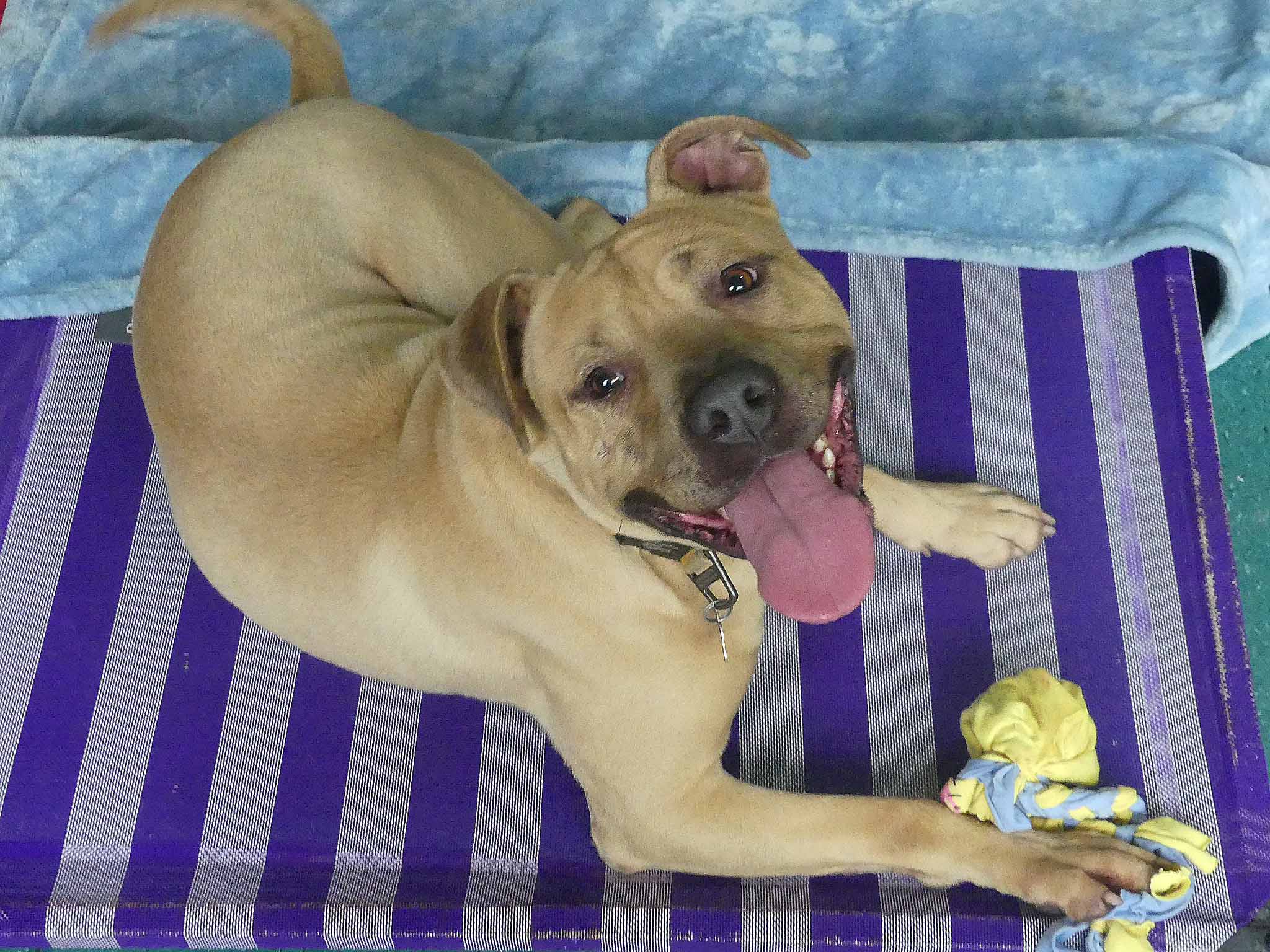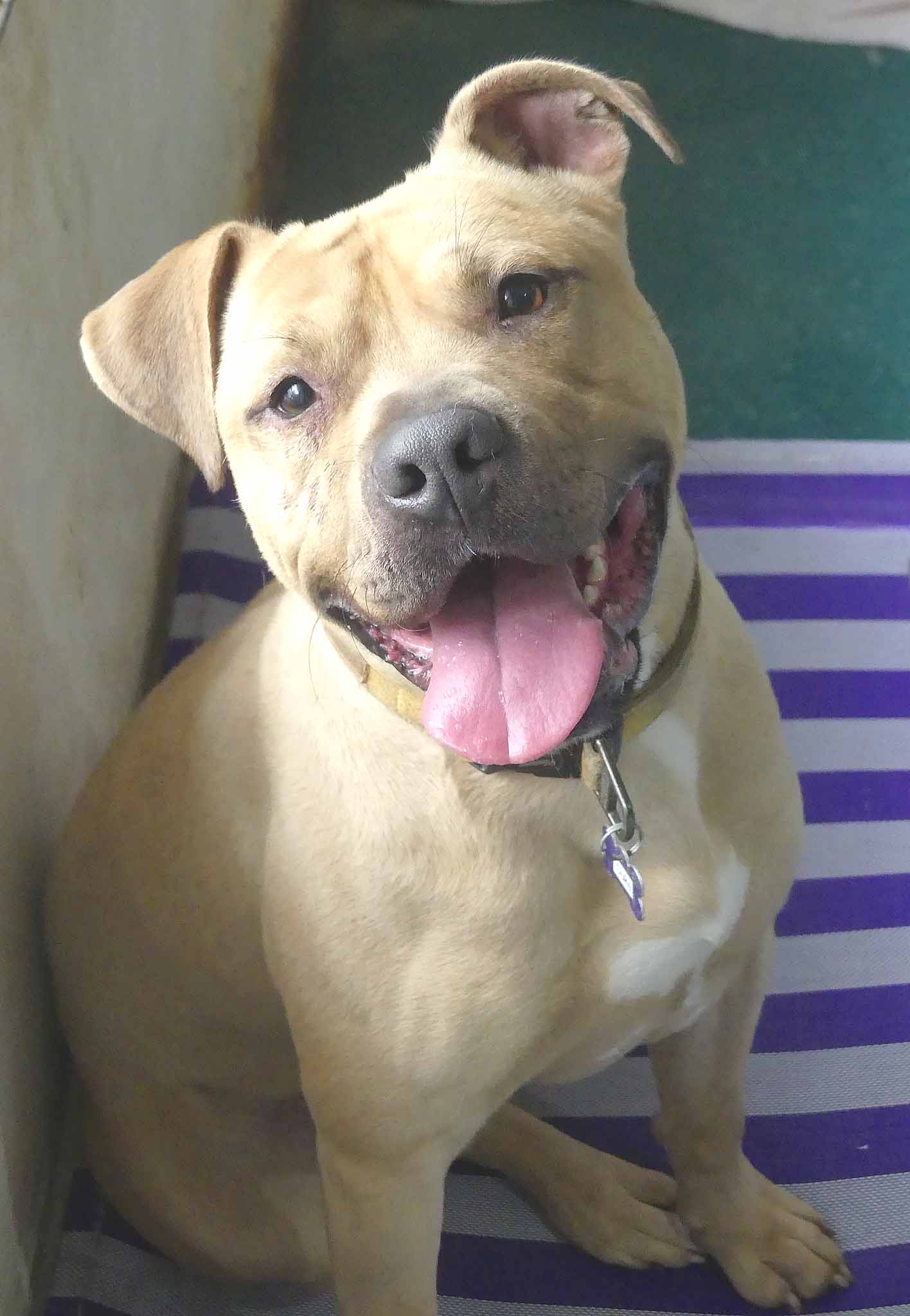 Duke is an active friendly boy who loves to play with rope toys, rubber toys and balls. He loves everybody and enjoys back scratches and cuddles. He moves from one person to the next for affection. Our dog trainer says: "Lovely gentle giant. He interacts well with children. Copes with children play and does not chase or jump up. He sits and shakes paws when asked by the kids. He loves playing ball. Due to his strength, he is better with older children." He walks mostly on loose lead but there are some dogs he does not like. He sits on command. Walker say "He likes to get close for cuddles and reassurance and was not super interested in treats." He has a smooth coat and weighs 28kg.