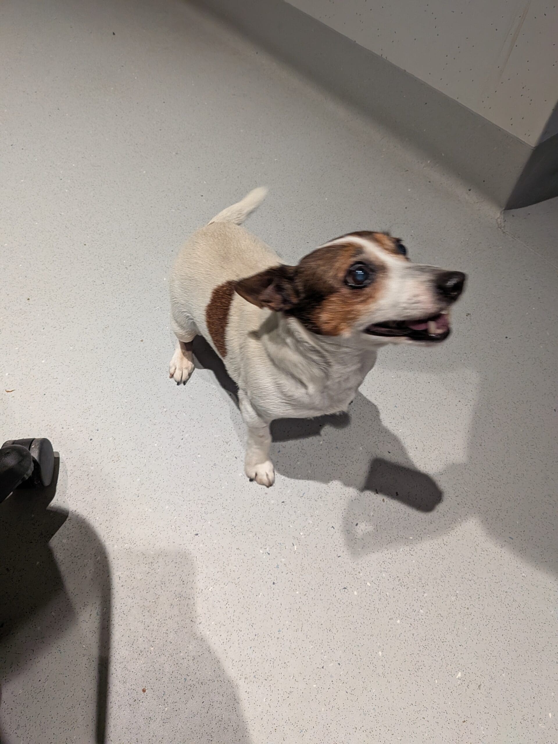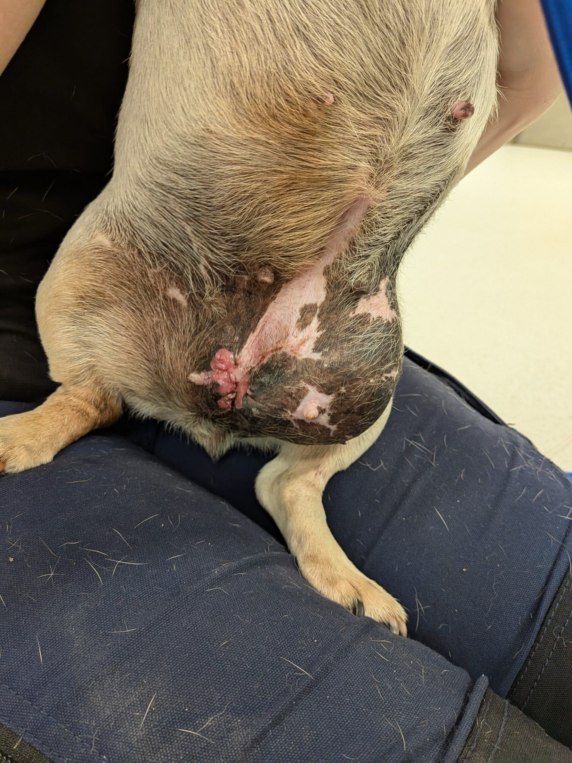 Little Gem ended in the pound after her owners abandoned her when they went on holidays. She came with a huge hernia with organ entrapment as well as a mammary tumour (pic attached). Gem has gone so well through the surgery and is so bright and happy. She will need a dental in a few weeks when she has fully recovered. Gem is a bit of a fussy eater being keen on chicken breast and some cat foods. She is social with other small dogs but can get jealous of attention and affection from a human. She has a short coat and weighs 5.2kg.