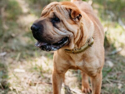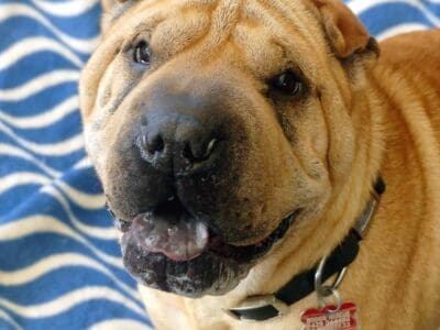 Jeff is a lovely friendly calm boy. He came from the pound with terrible ear infections which are under treatment, and he is doing well. Jeff loves his treats and for a sharpei he has an affectionate nature. He walks calmly on lead and is easy to handle and bath. He has a short coat and weighs 18.3kg.