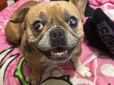 Lola is such a sweet gentle affectionate little Frenchie. She is social with other small dogs and has such a calm quiet nature. Lola has come from the pound with a cherry eye (right) that we plan to repair as well as corneal scarring which cannot be fixed. She has infected ears that we are currently treating. Her ear canals are narrow, and she has a cauliflower ear from having untreated ear infections in the past. She is a beautiful lady who is looking for a home where she gets the care she deserves. She has a short coat and weighs 10.5kg.