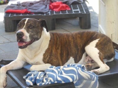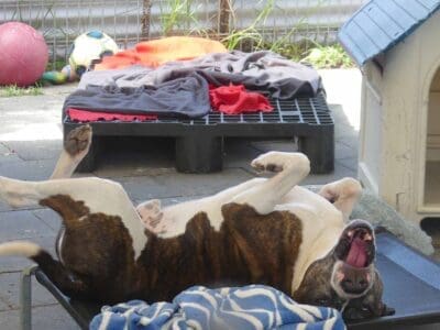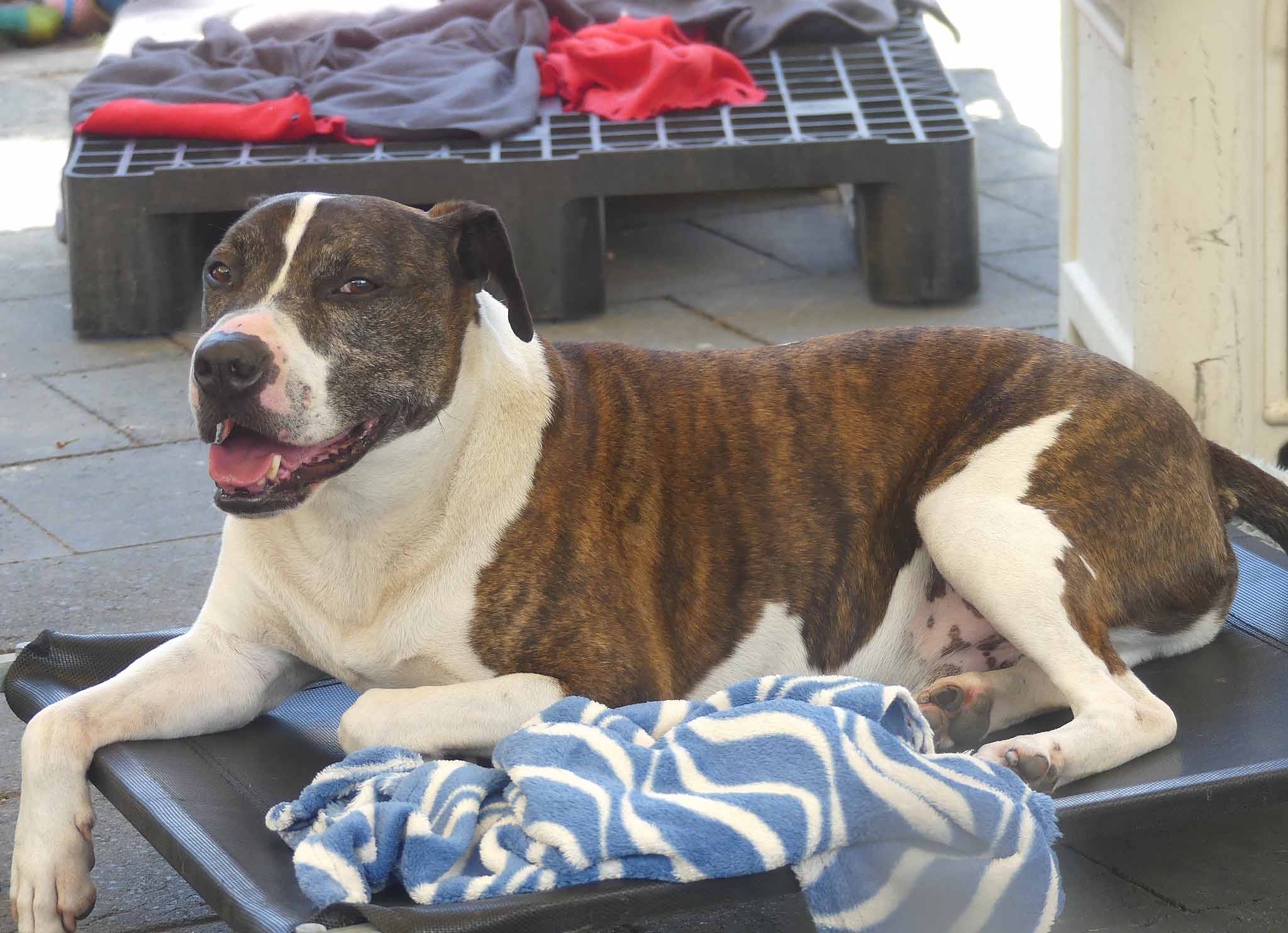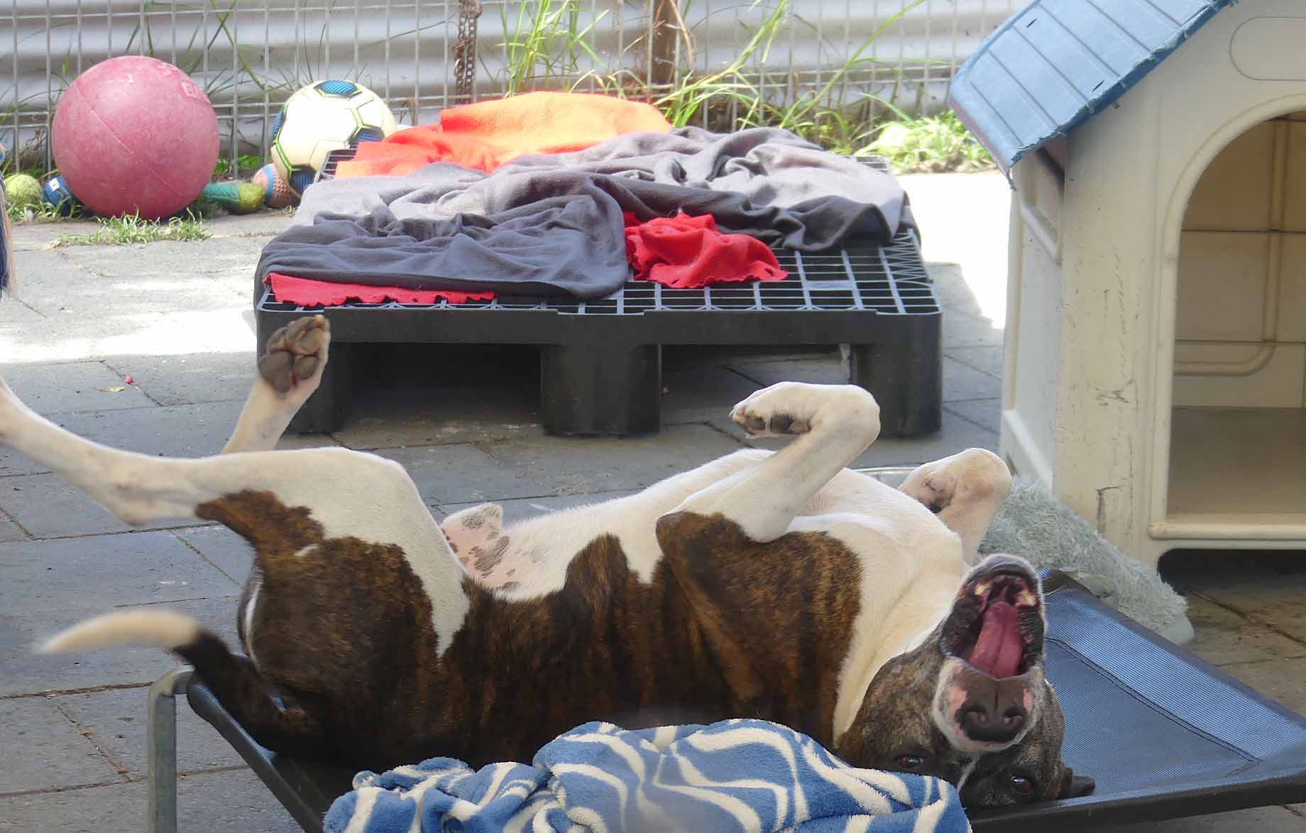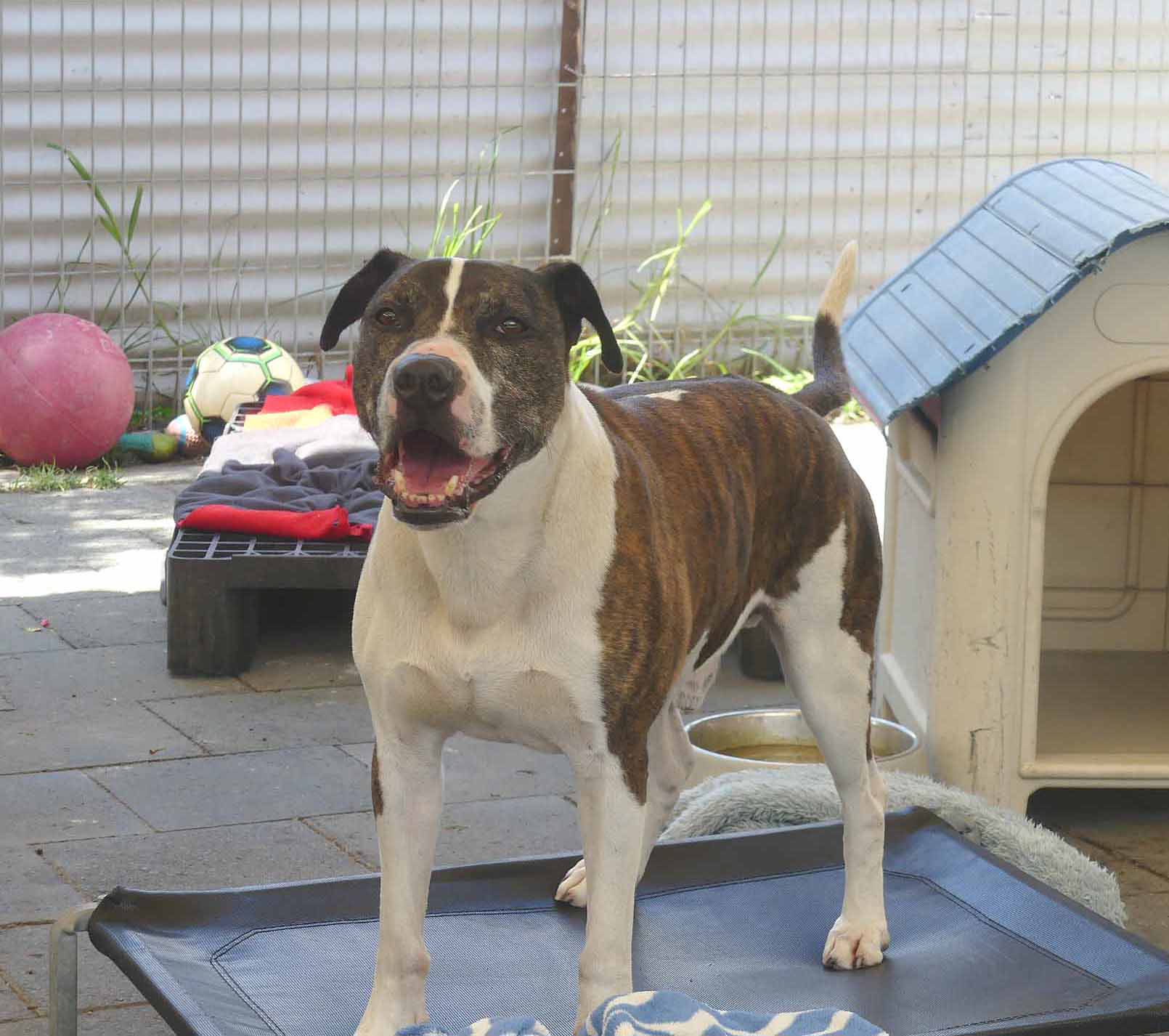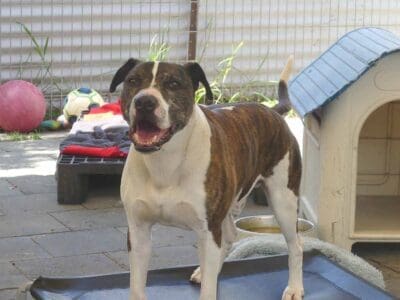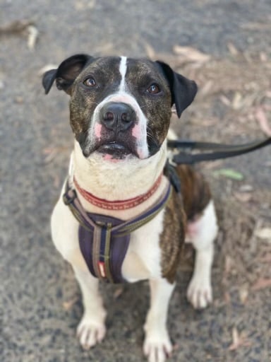 Moe is an active friendly boy. He loves being around people and is easy to handle. Moe is suitable around kids 12+yo as he can get jumpy and mouthy. He gets very anxious around lots of other dogs in a shelter environment. He walks well on lead providing there are no other dogs around. He is best suited with a family who have had unsocialised dogs and live in an area where he can he walked on lead without encountering many dogs. Walkers say: "Moe used to lunge at every dog we passed by, now he pays attention to them but keeps walking with encouragement” “Pulled on lead, but not reactive to dogs. Ignored them”, “Pulled on lead a but then eased into walk. Lunged a bit at other dogs but ok with close lead hold.”, Did ok around other dogs as long as he was distracted”, “Did so well, loved his treats today, seemed more relaxed than other times. Ignored all the cars, watched big trucks go by, lunged at one dog when he barked first and ignored the huskies”, “Very nervous at start but warming up very easy. Loves belly rubs and affection. We loved him!” Loves to sniff everything. Reluctant to take treats at first but as he relaxed he would then take them. Very excited in the car. On the way back he was almost fell asleep on the back seat." He has a smooth coat and weighs 21.6kg.