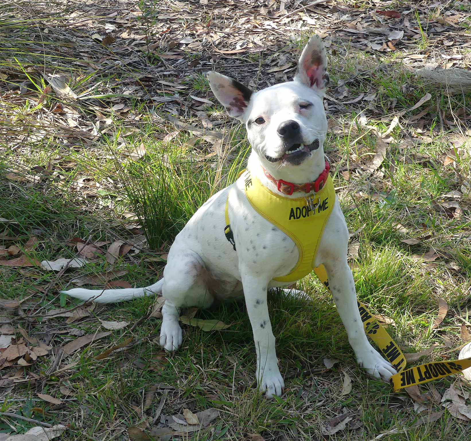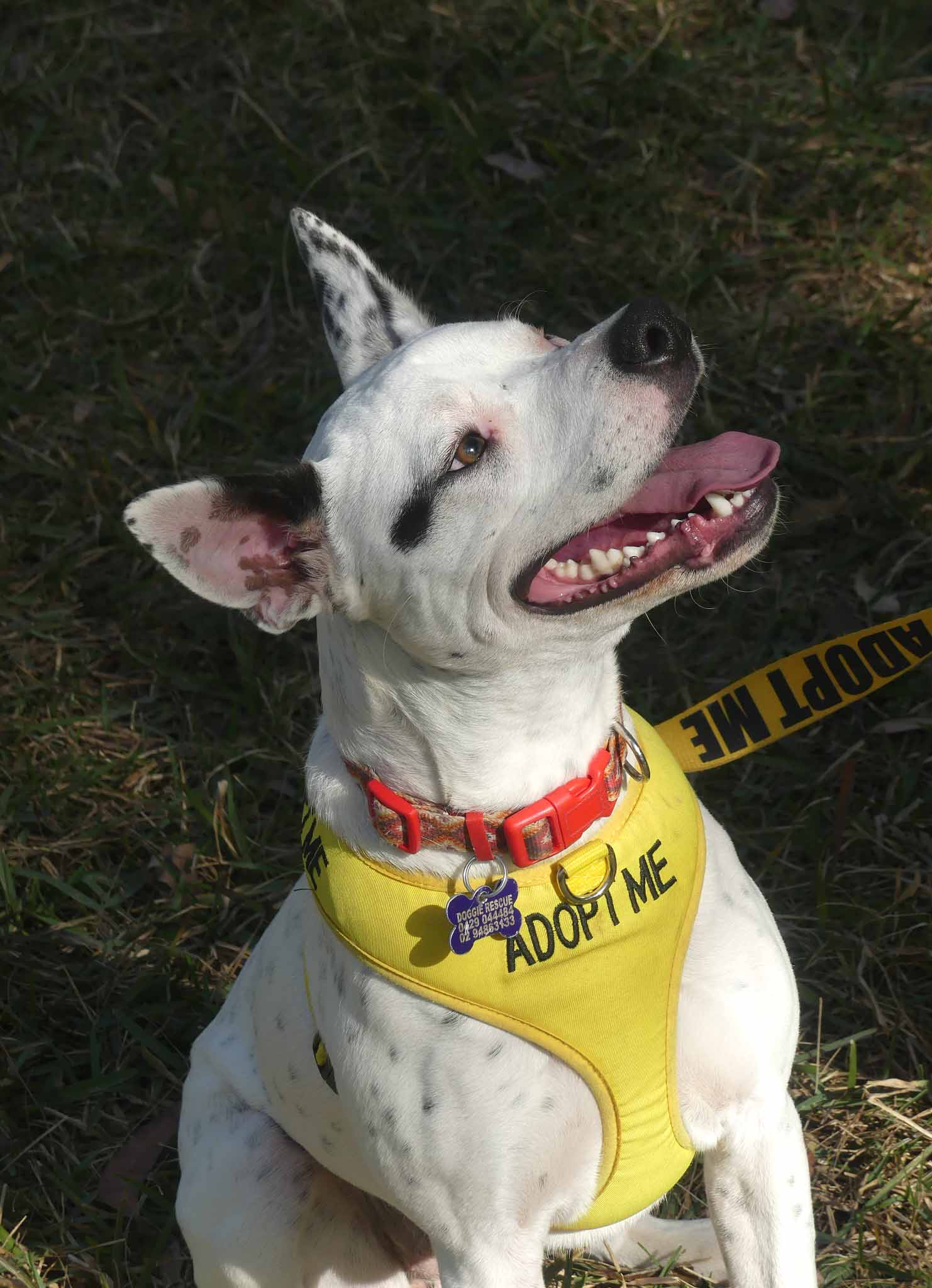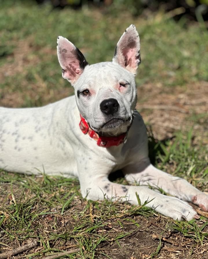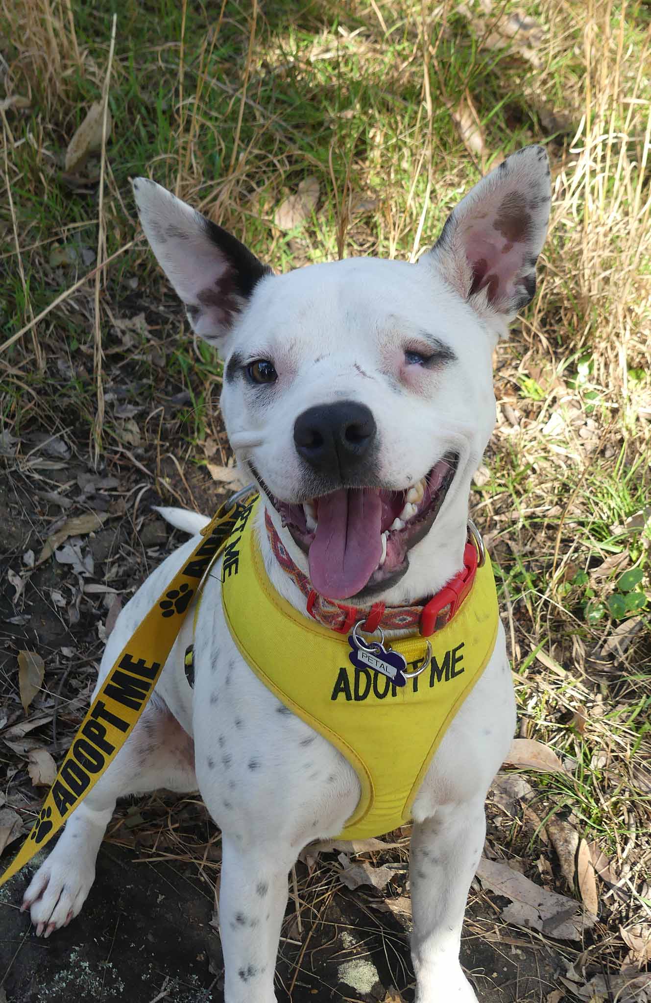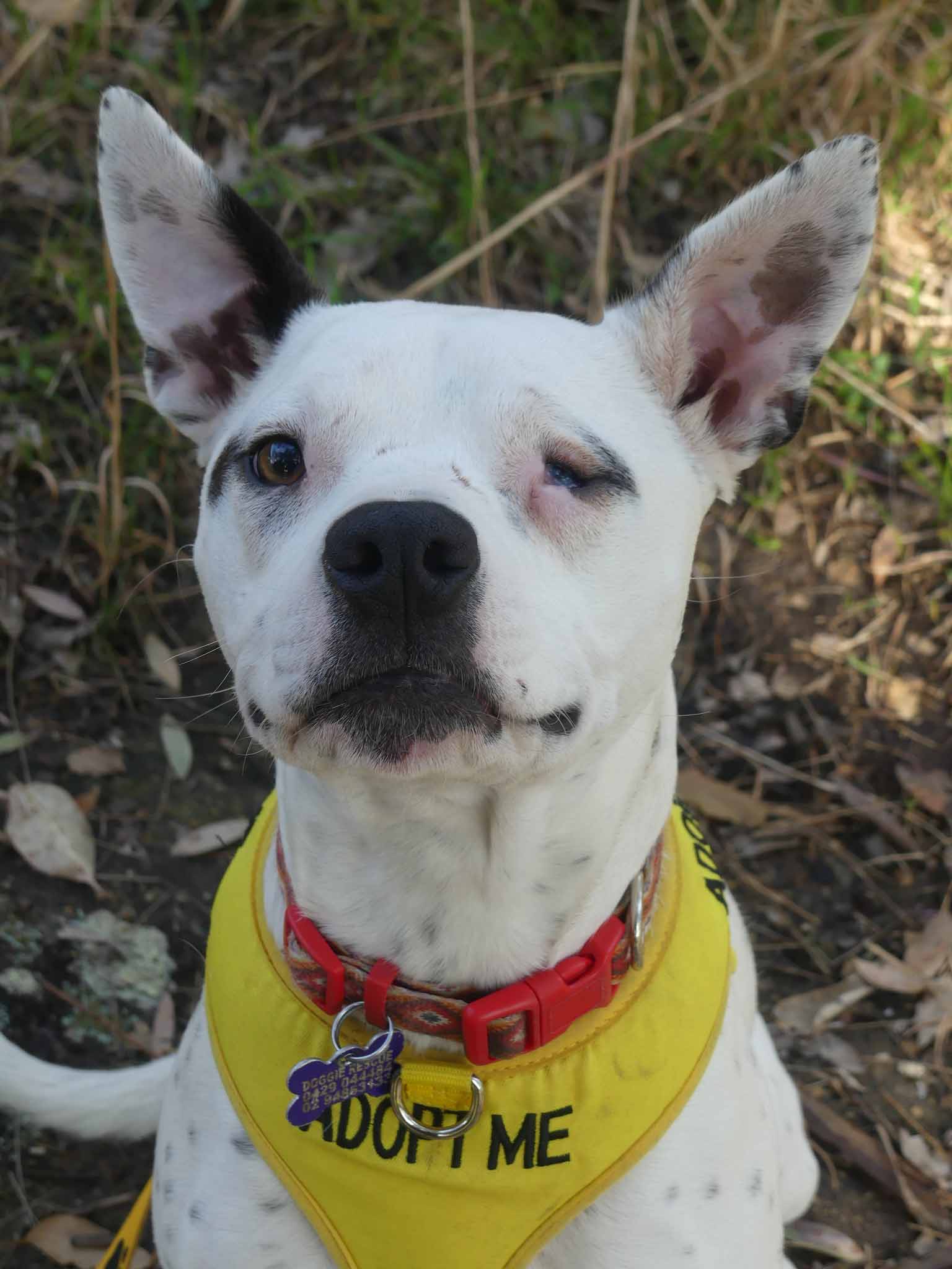 Petal is a sweet fun-loving pup who is eager to learn. She has a lovely affectionate nature and is so playful with other smaller dogs. It seems Petal had an injury in which she lost the sight of her eye, most likely from a dog bite. Nevertheless, it does not stop her playing and enjoying life. She is best with dogs her size or smaller who love to play and rumble. She has a very inquisitive nature and so smart! OMG! She is nervous out walking around other dogs, perhaps related to her injury and not being able to see what is coming from one side so she needs an experienced owner who watches out for her. She has a short coat and weighs about 16kg.