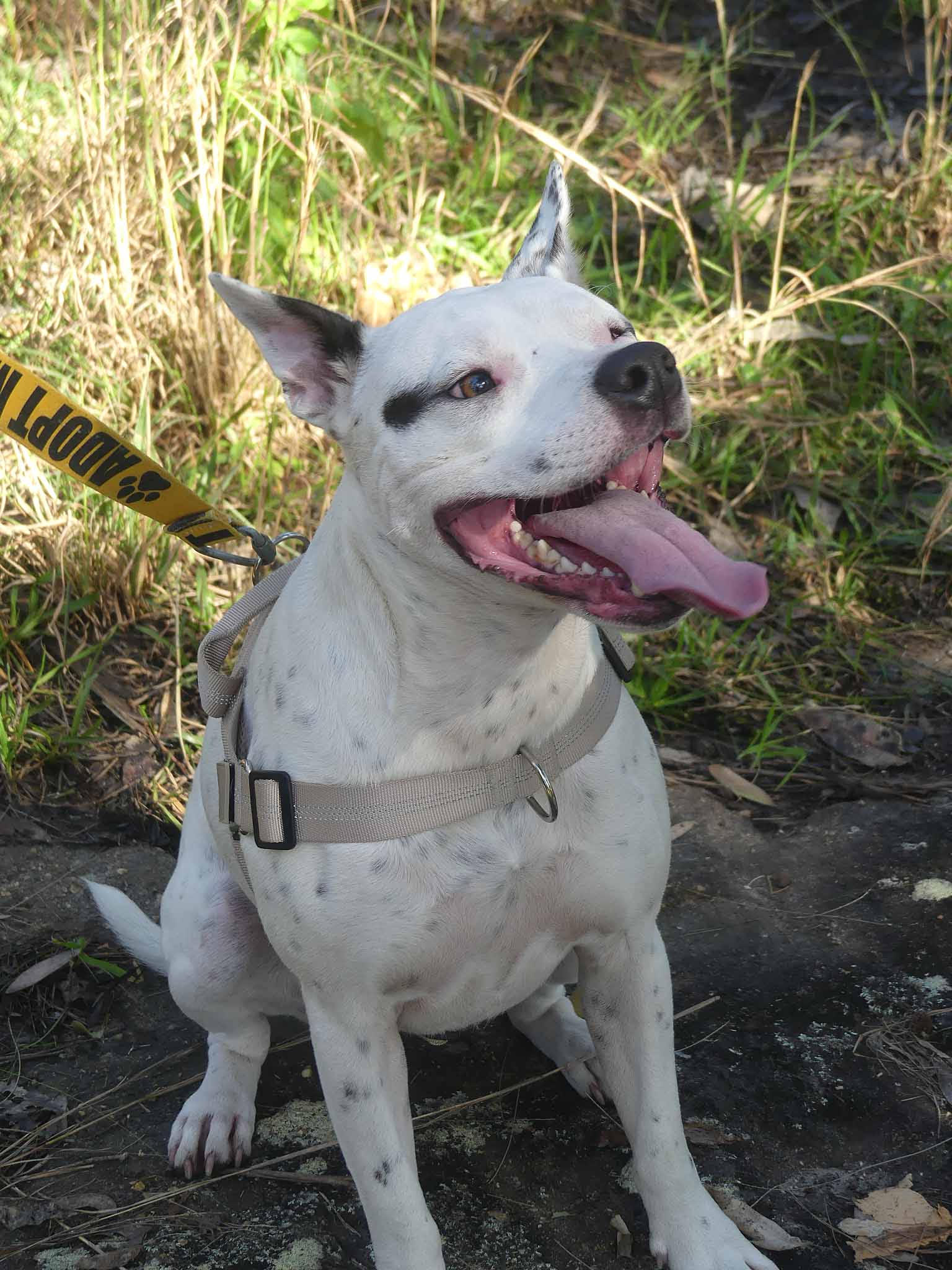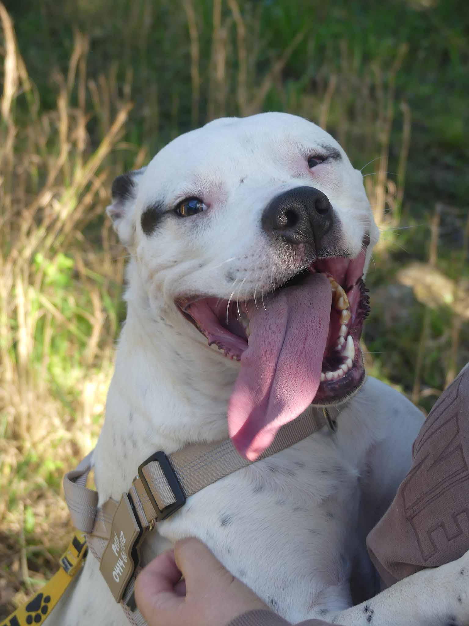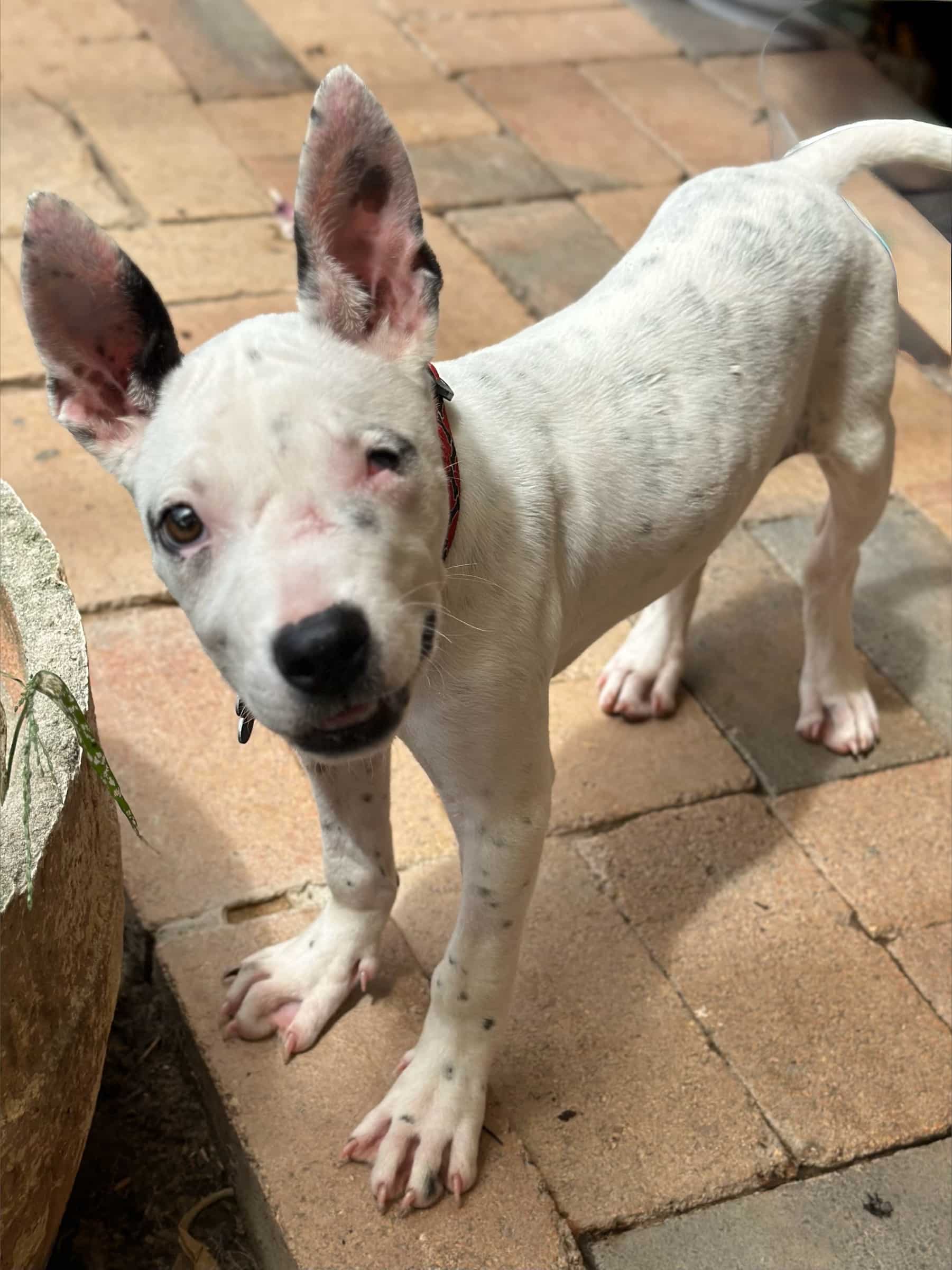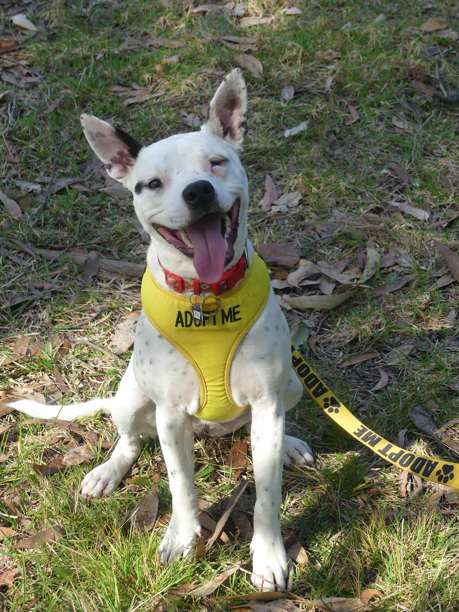 Petal is a sweet fun-loving pup who is eager to learn. She has a lovely affectionate nature and is so playful with other smaller dogs. It seems Petal had an injury in which she lost the sight of her eye, most likely from a dog bite. Nevertheless, it does not stop her playing and enjoying life. She is best with dogs her size or smaller who love to play and rumble. She has a very inquisitive nature and so smart! OMG! She is nervous out walking around other dogs, perhaps related to her injury and not being able to see what is coming from one side so she needs an experienced owner who watches out for her. She has a short coat and weighs about 16kg.