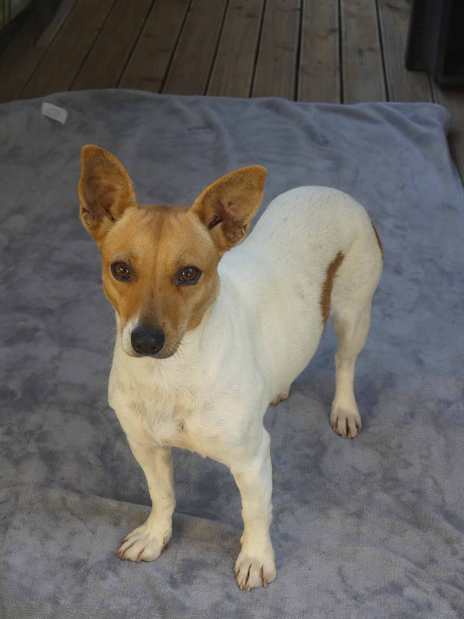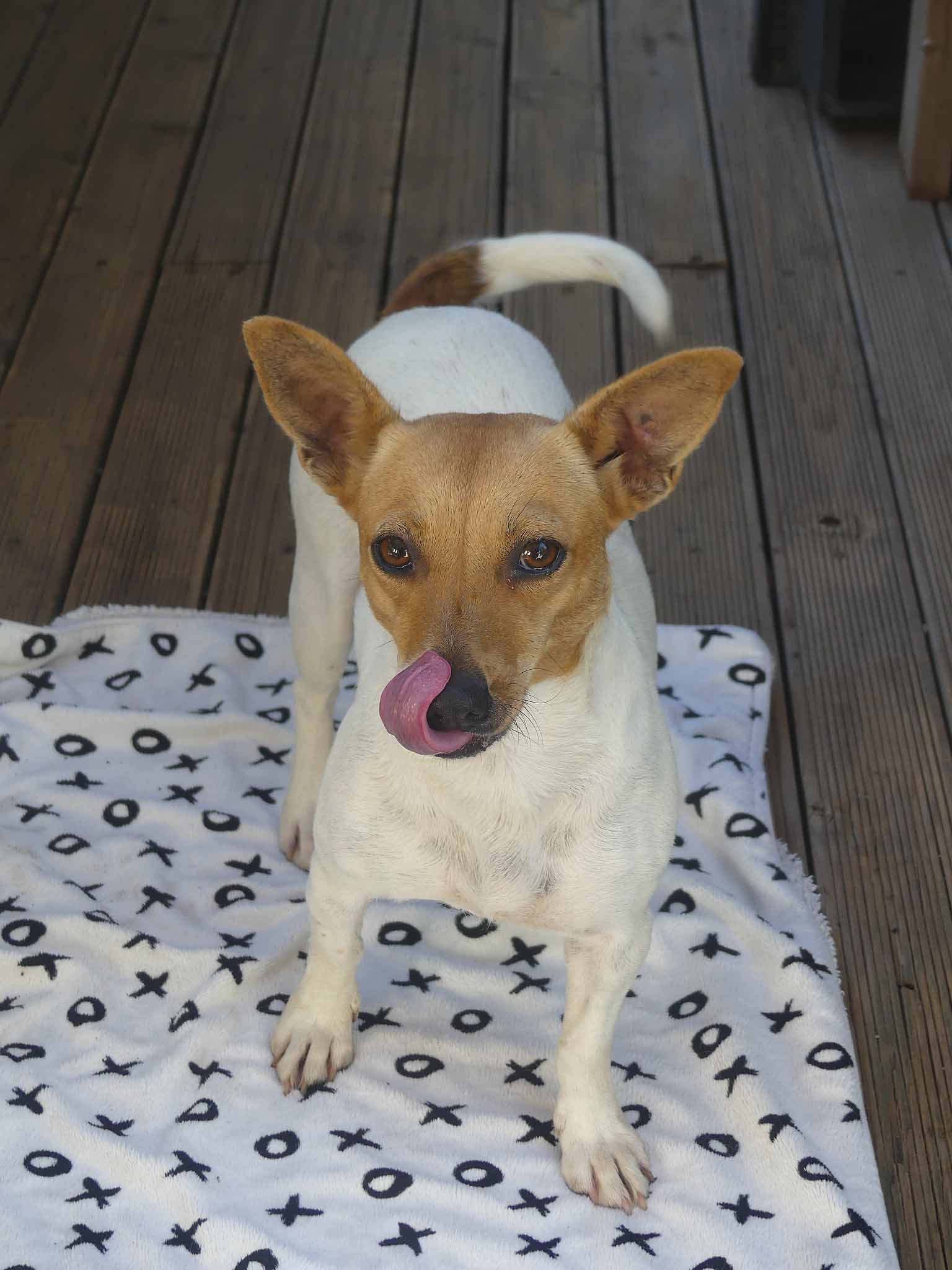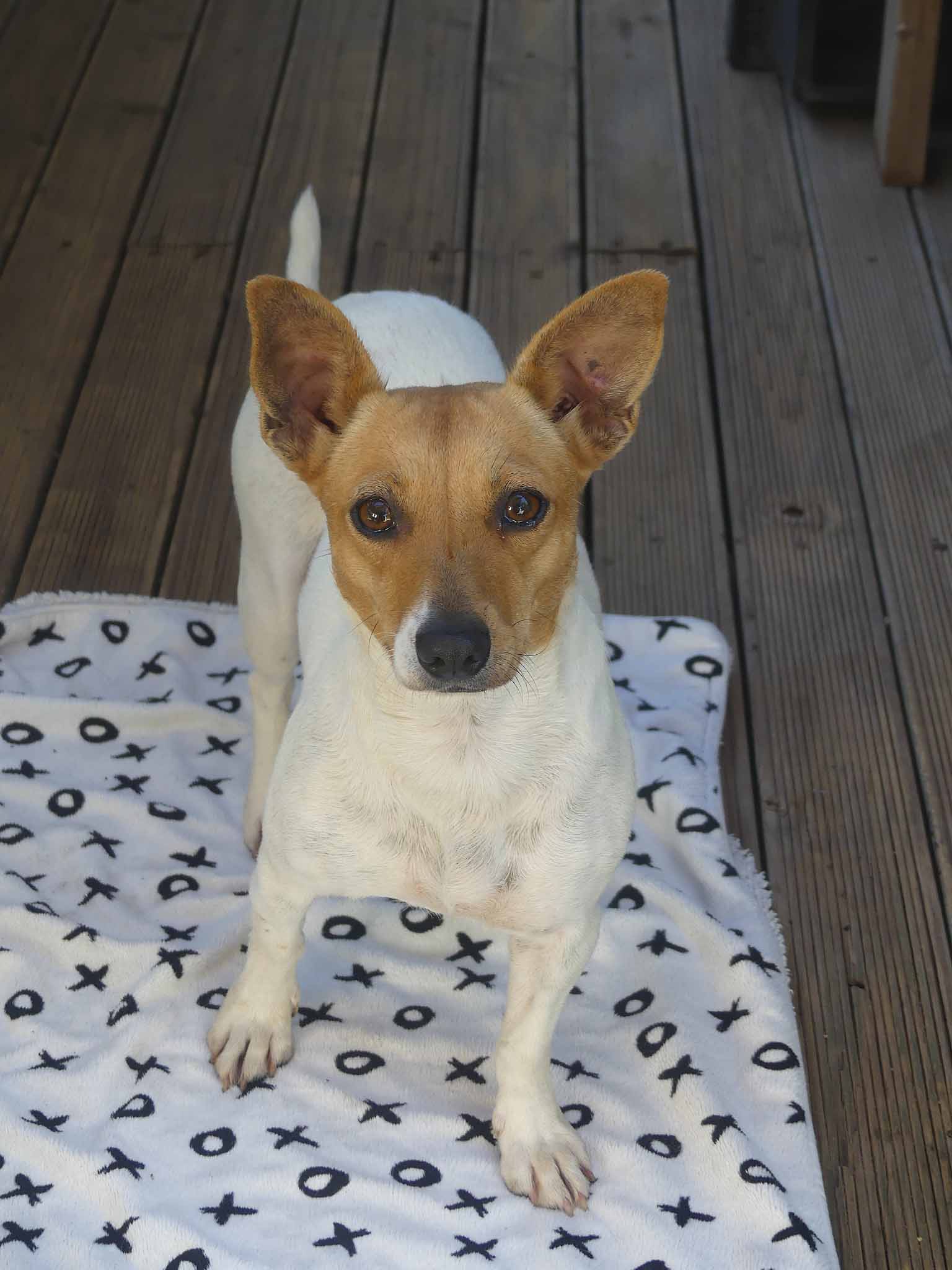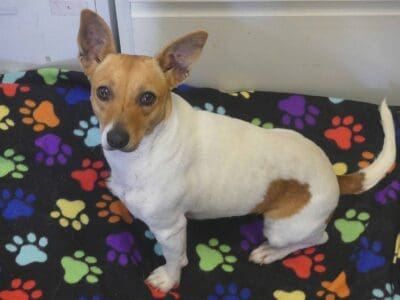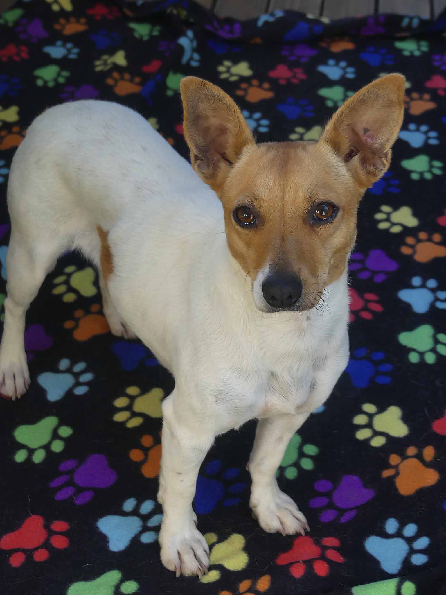 She is scared of storms and best in a home with no cats or pocket pets. She has a short coat and weighs 7.7kg.