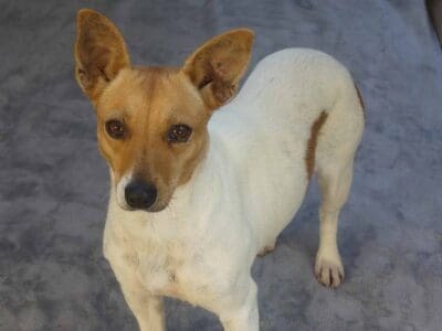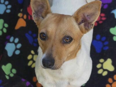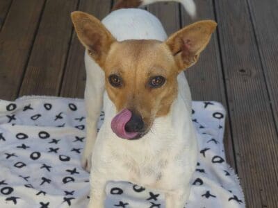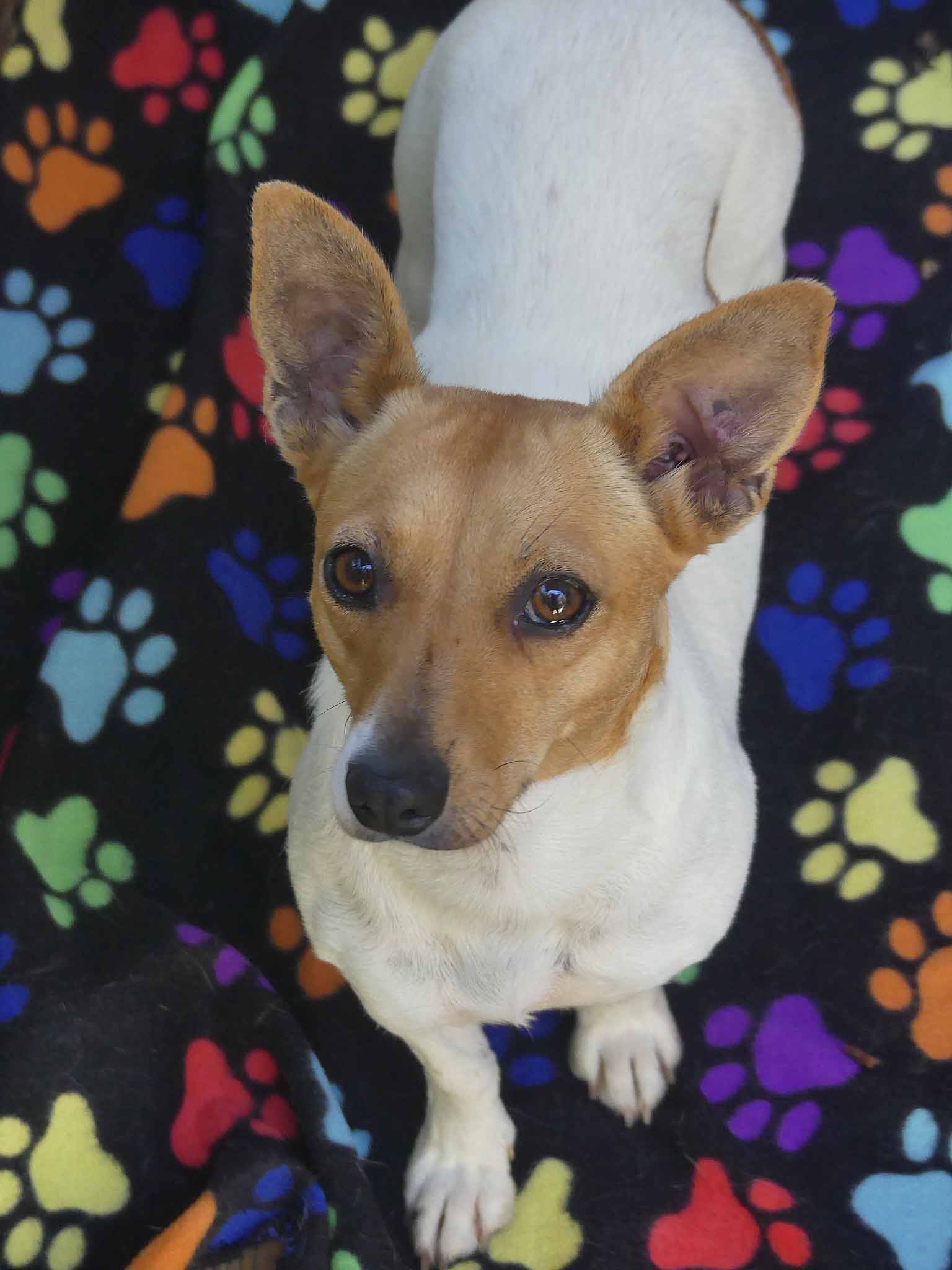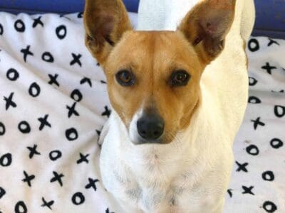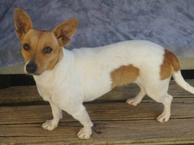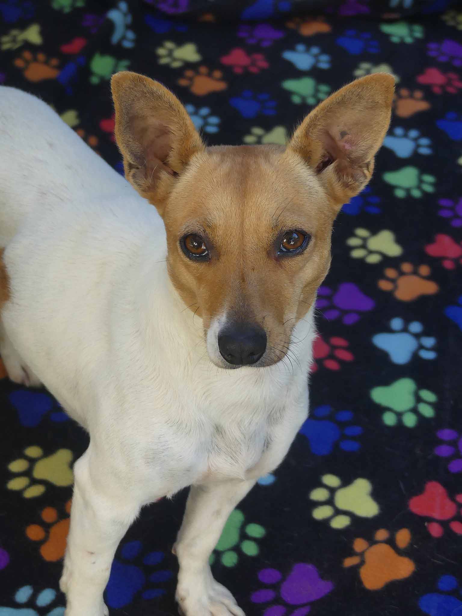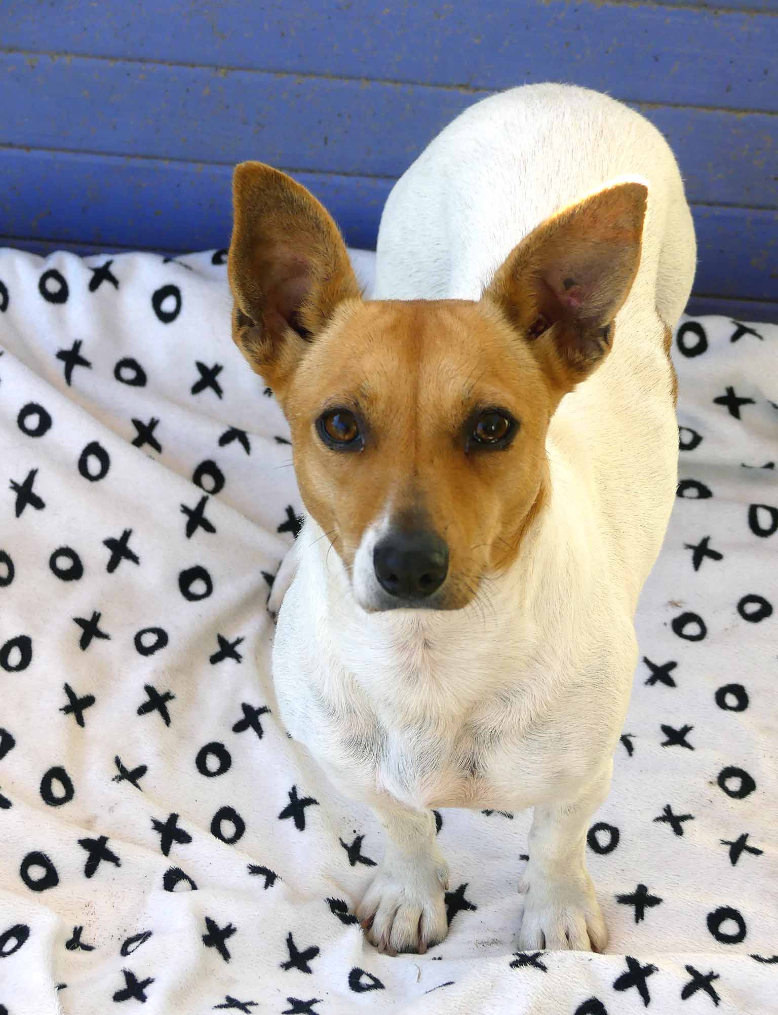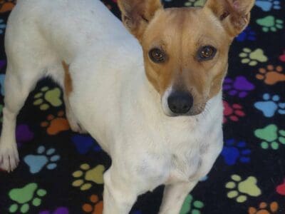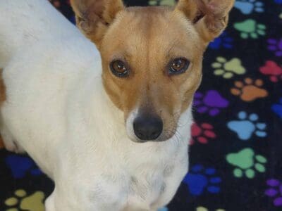 She is scared of storms and best in a home with no cats or pocket pets. She has a short coat and weighs 7.7kg.