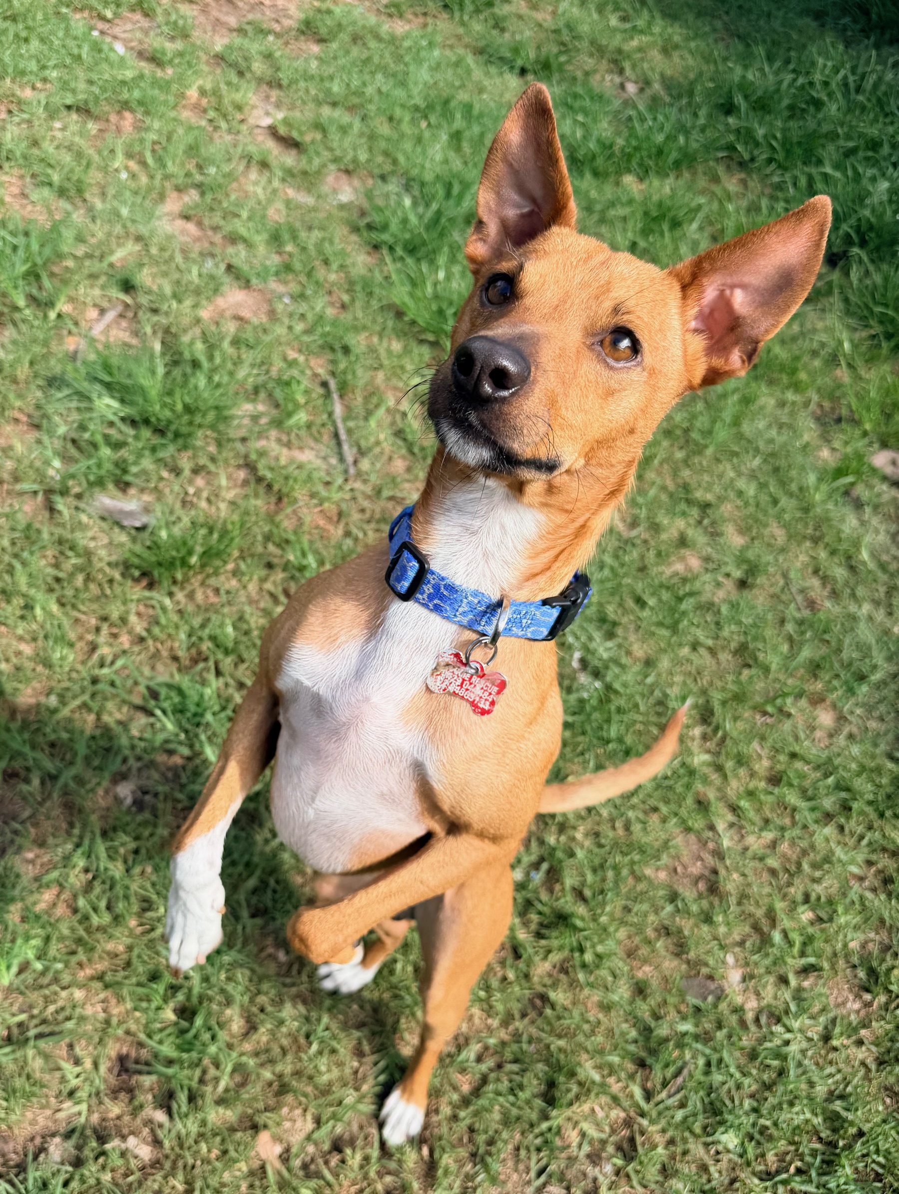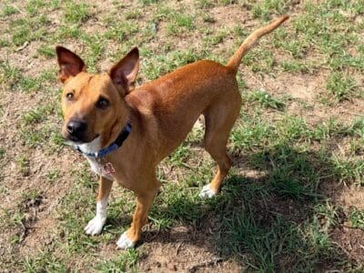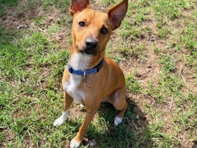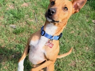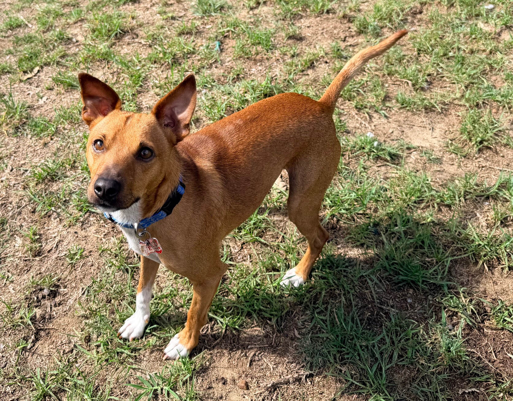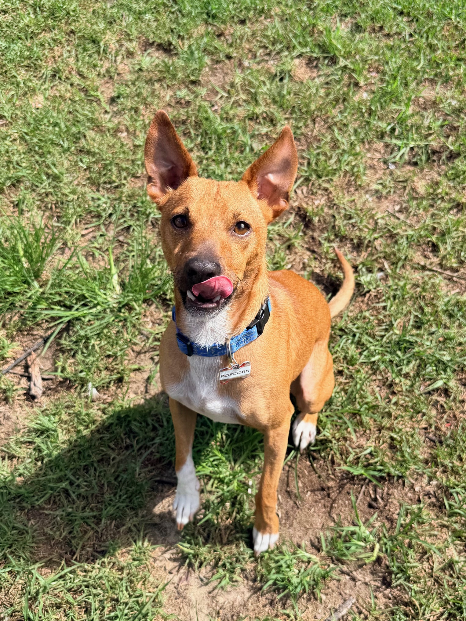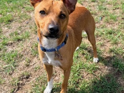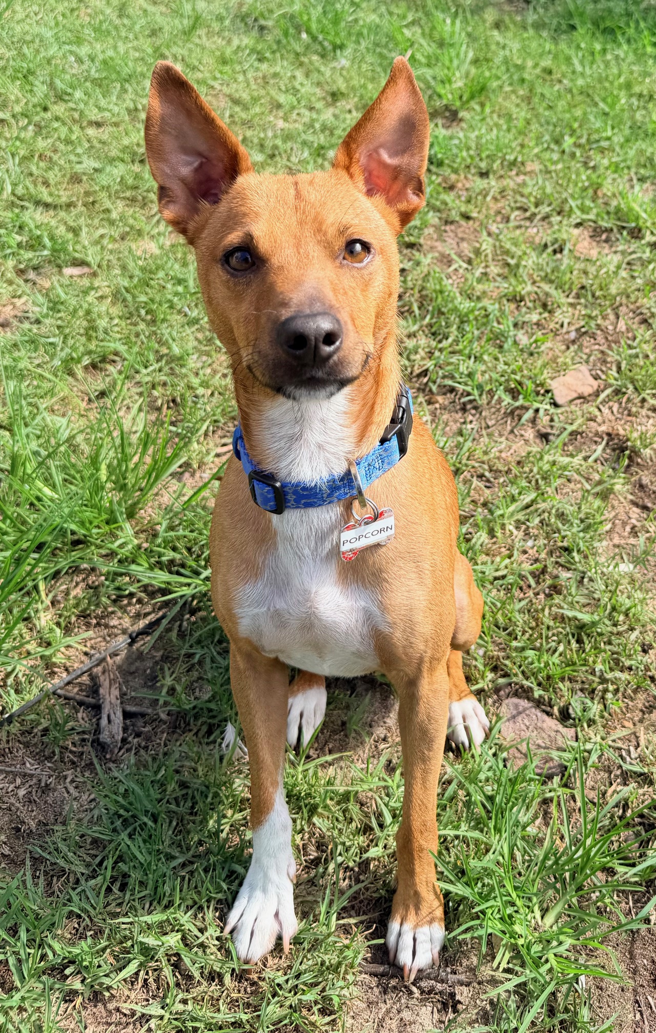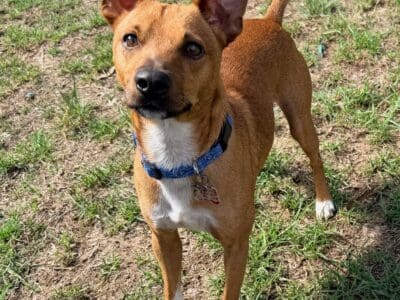 Popcorn is a bright active bouncy boy who loves to be involved in everything you do. He is affectionate and seeks out your attention. He is social with other small dogs but prefers to play with active dogs who like to rumble and chase. Popcorn is good walking on lead and is not disturbed by cars or motorbikes. He has a smooth coat and weighs about 7kg.