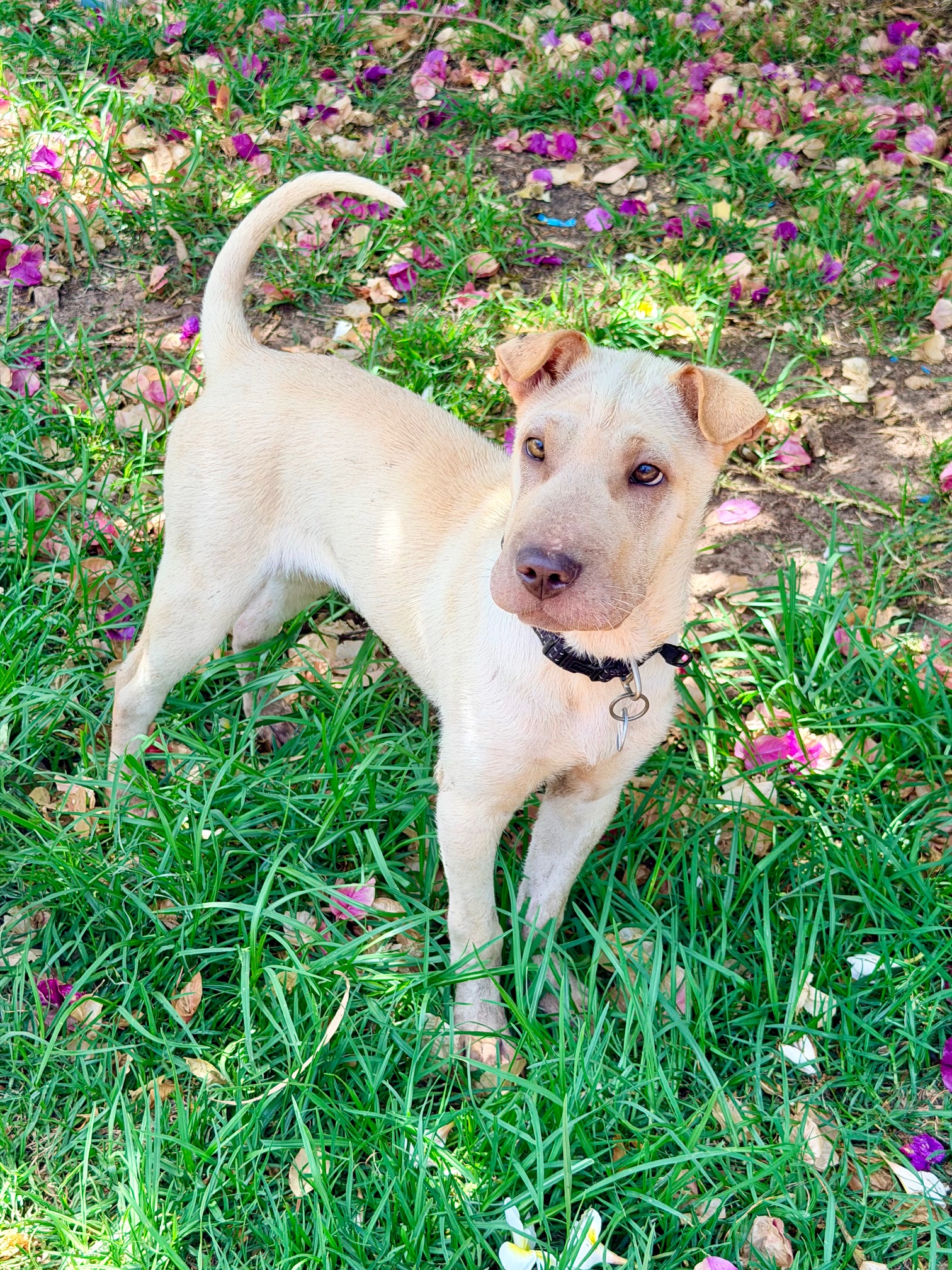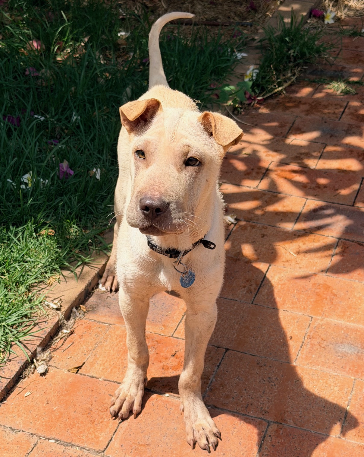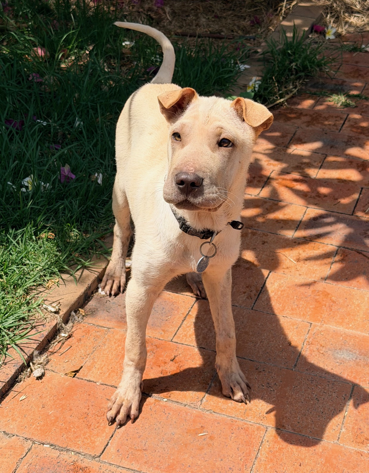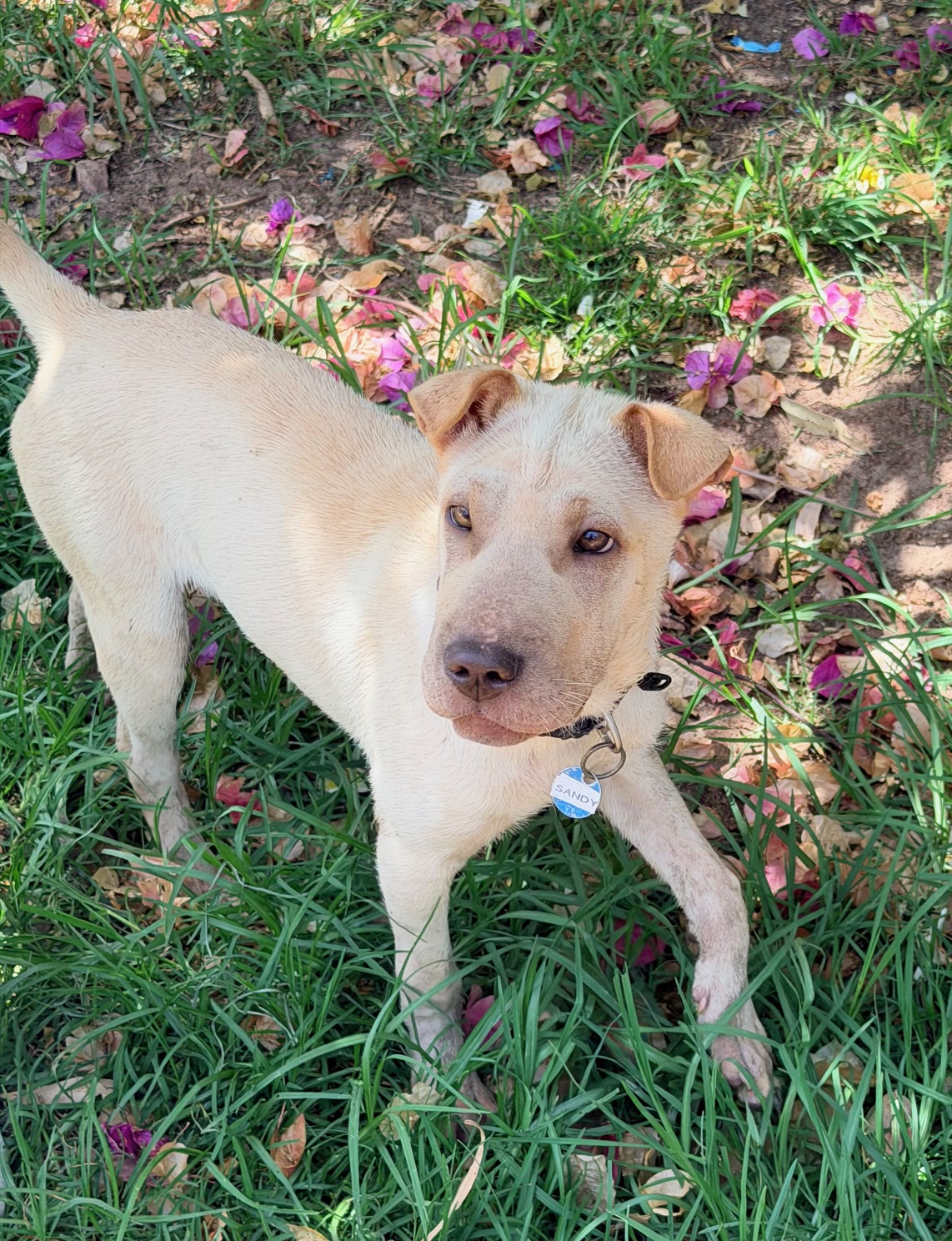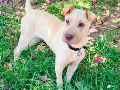 Sandy was dumped in the pound with her brother. The pound noticed she was very anxious and she could not walk on lead. Since coming to us, Sandy is gaining weight and has a few young doggy friends to play. Sandy is very gentle but reluctant to be handled by people. Everything seems new to her and needs an experienced family to expand her horizons. Having another relaxed dog around would certainly help her. She has a short bristly coat and weighs 10.9kg.