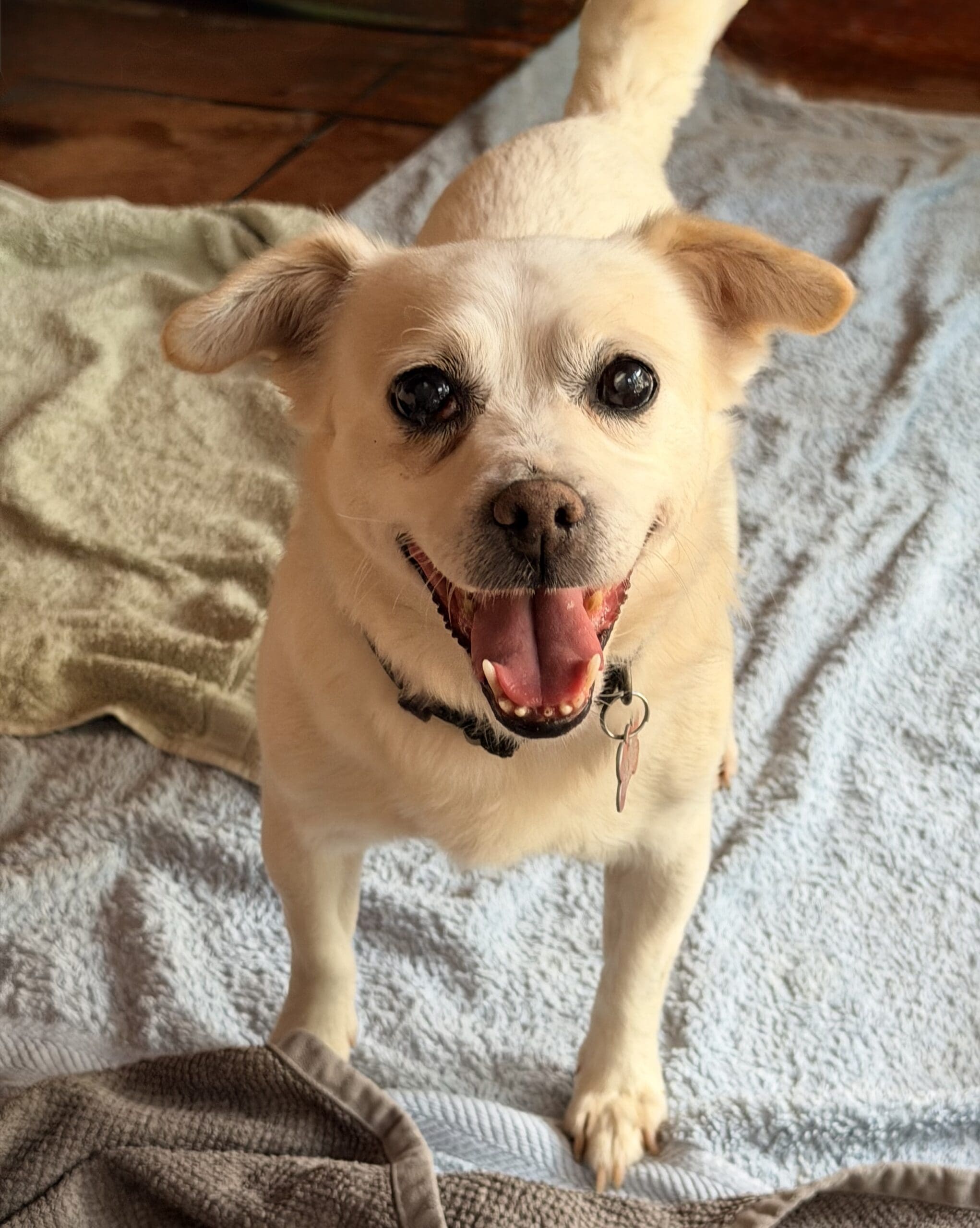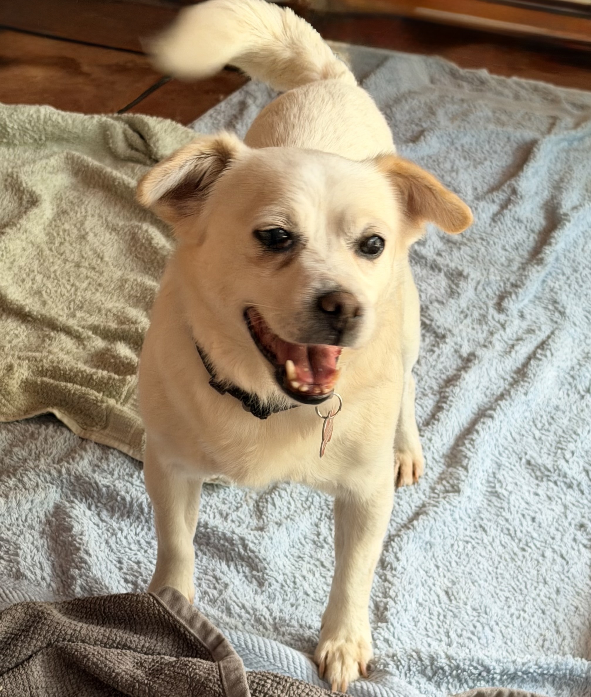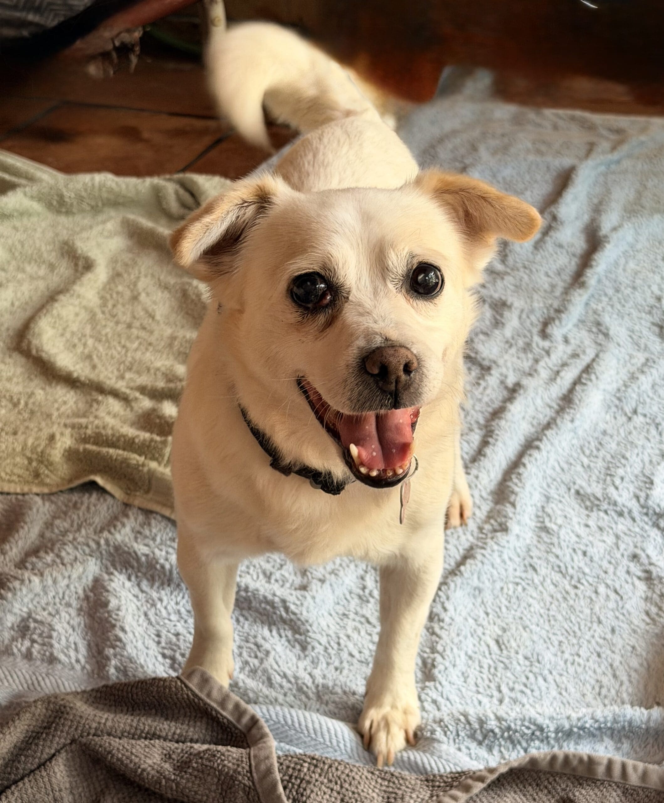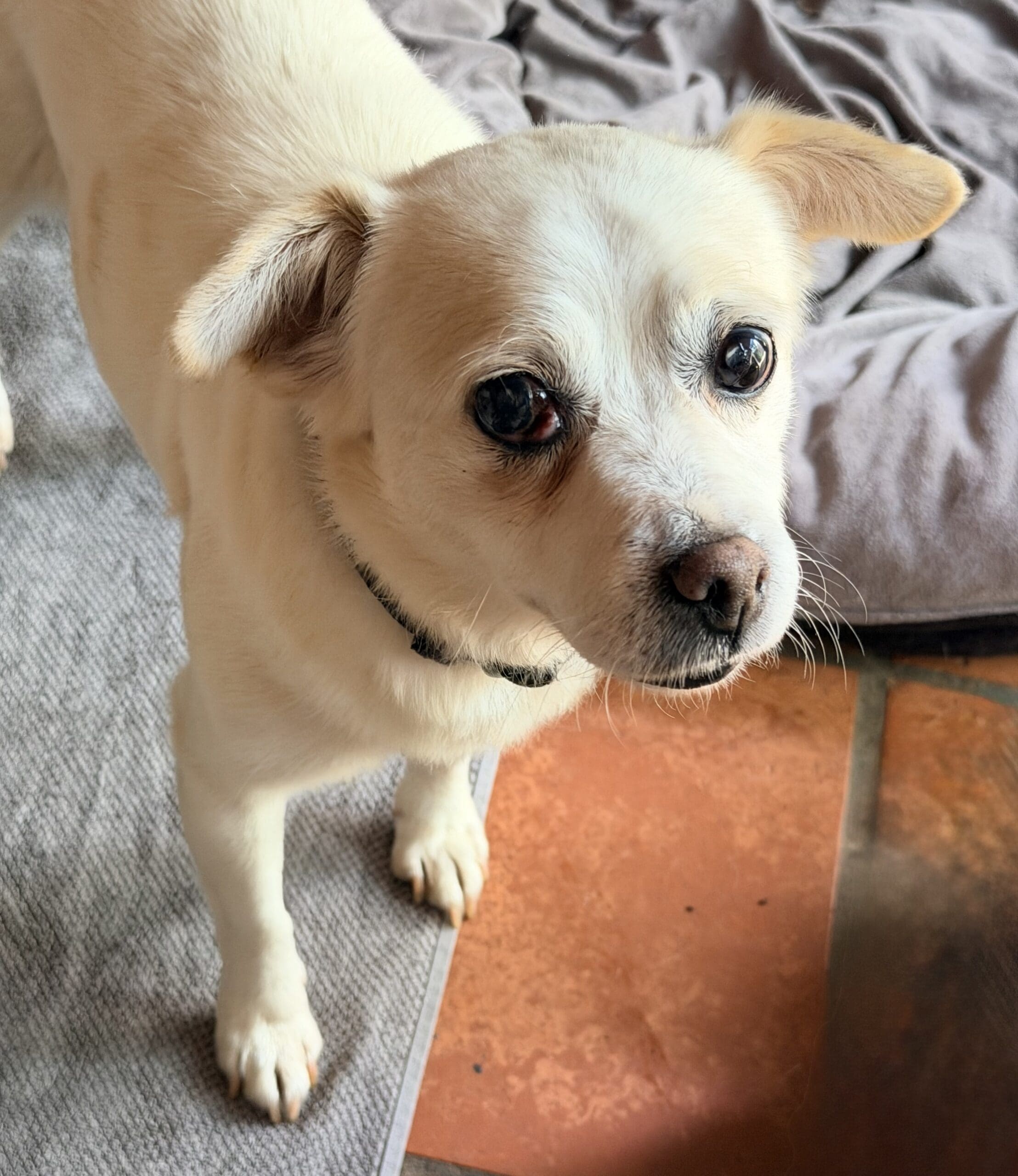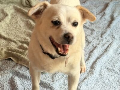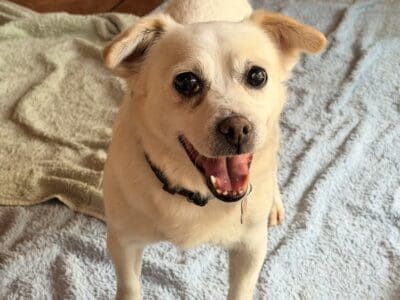Snowy is a gentle sweet natured boy who is social with other small dogs. He is very affectionate once he knows you. He came from the pound with a list of medical problems that we are working through. Snowy has a charry eye in right eye that needs repair. He is also in need of a dental and chest x rays as he has a heart murmur. He has some cataract development in both eyes but he can see well in good light. He has a short soft coat and weighs 8kg.