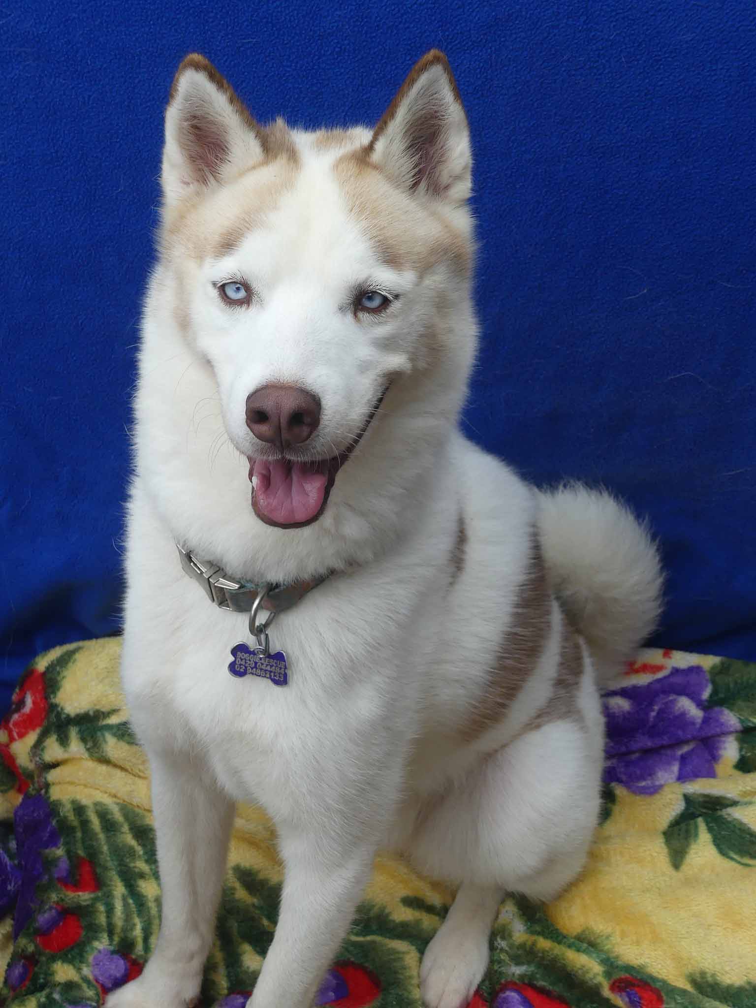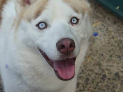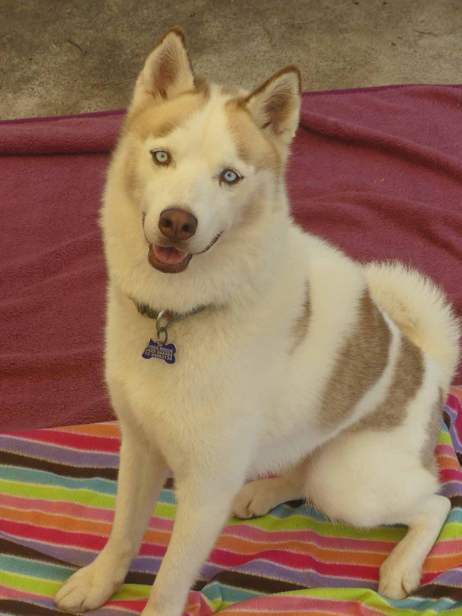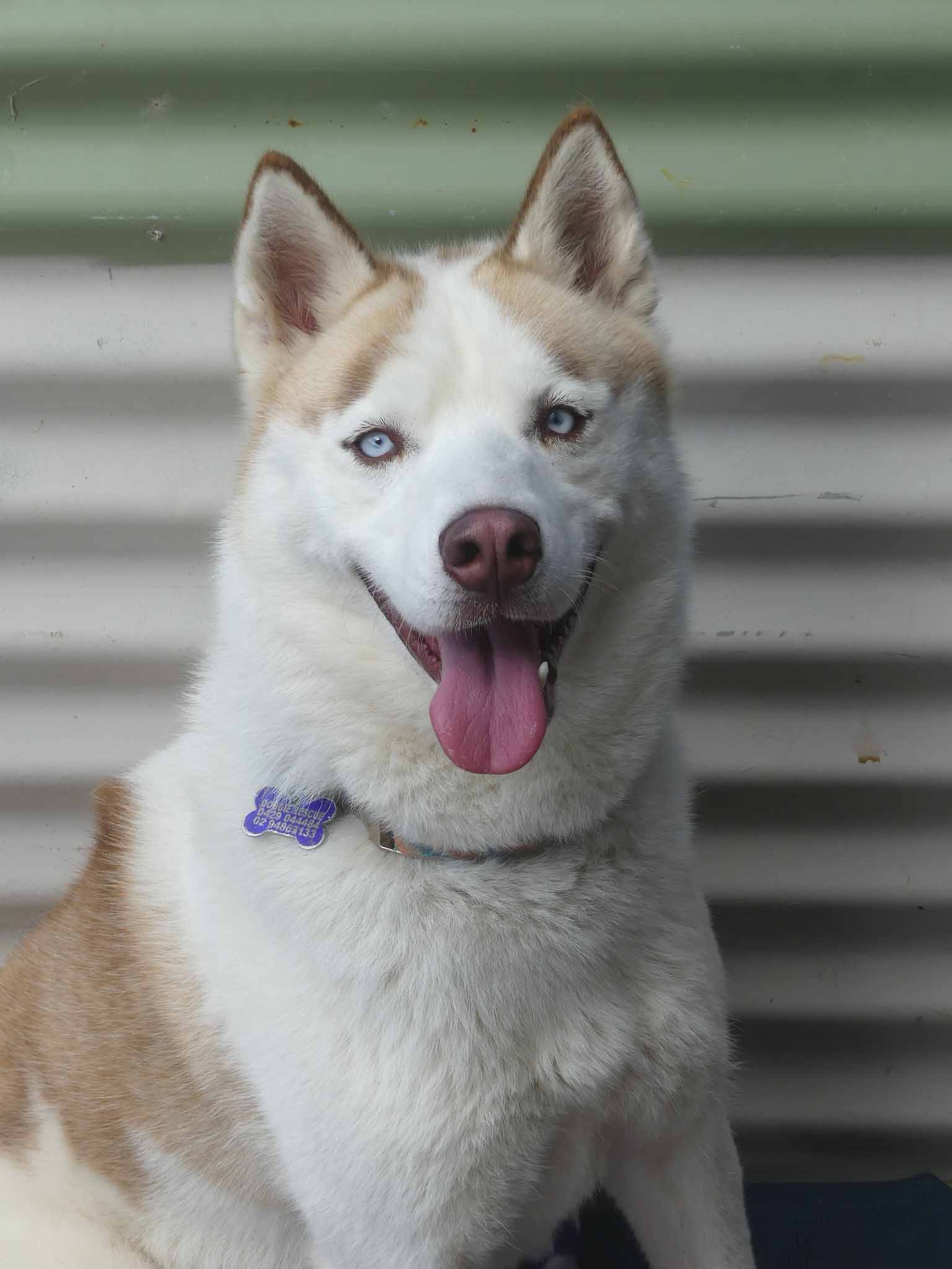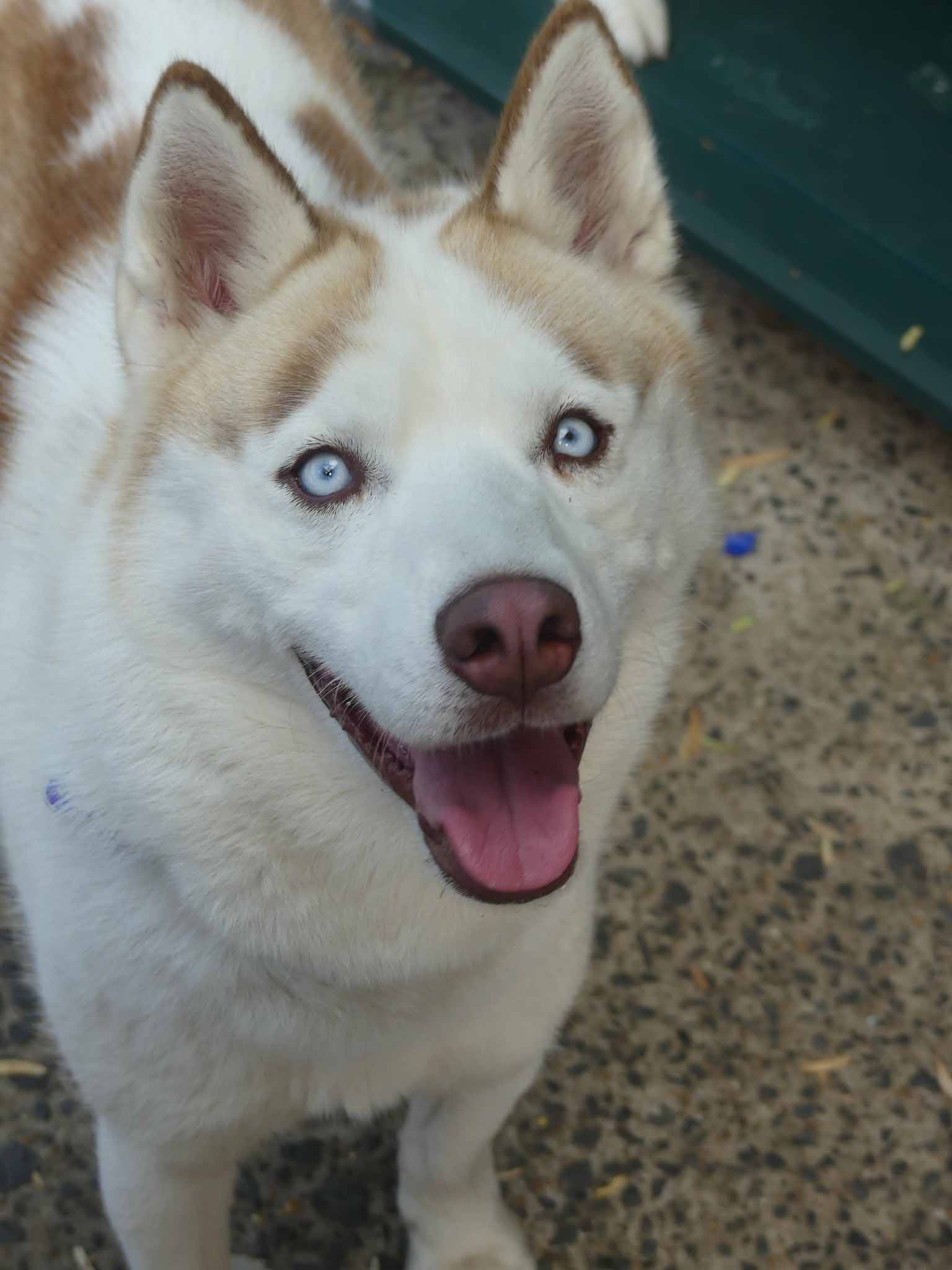 Spirit is very playful and puppy like amongst his mates. He is still a bit scared to walk on lead. He walks with encouragement and at a very slow pace. Walkers say: "Hesitant to start but walked well once interested in surroundings. Likes the long grass.", "He is very timid. Seems not very interested in walking far from shelter", "He is friendly but lazy(scared) for walk. He prefers to be taken in arms (like a baby!), "Be patient with him. He will decide when/where he goes. Beautiful dog". Spirit like all huskies has an undercoat that sheds seasonally and needs lots of brushing. He weighs 11.4kg and is still underweight. He has a bit of growing to do.