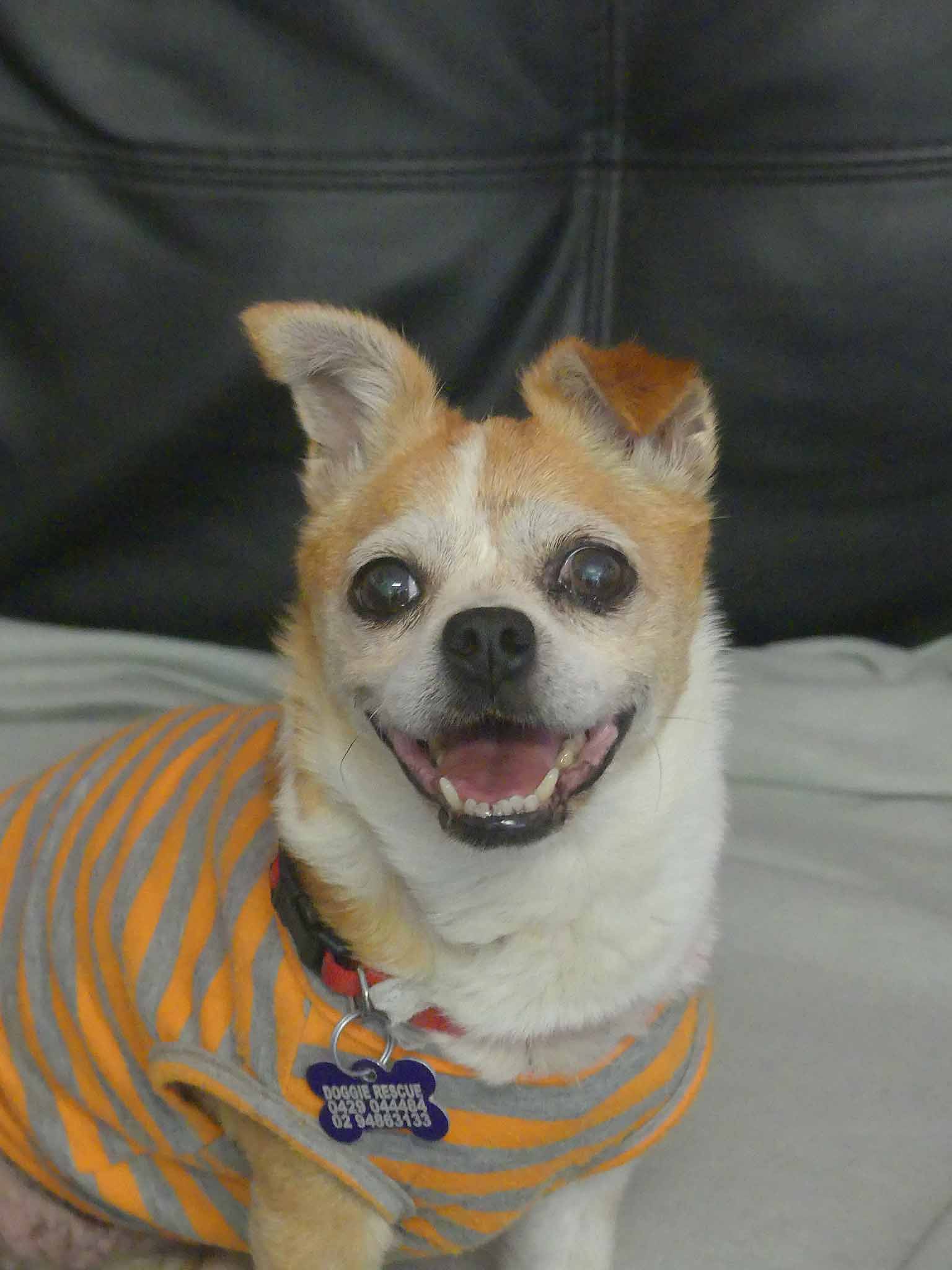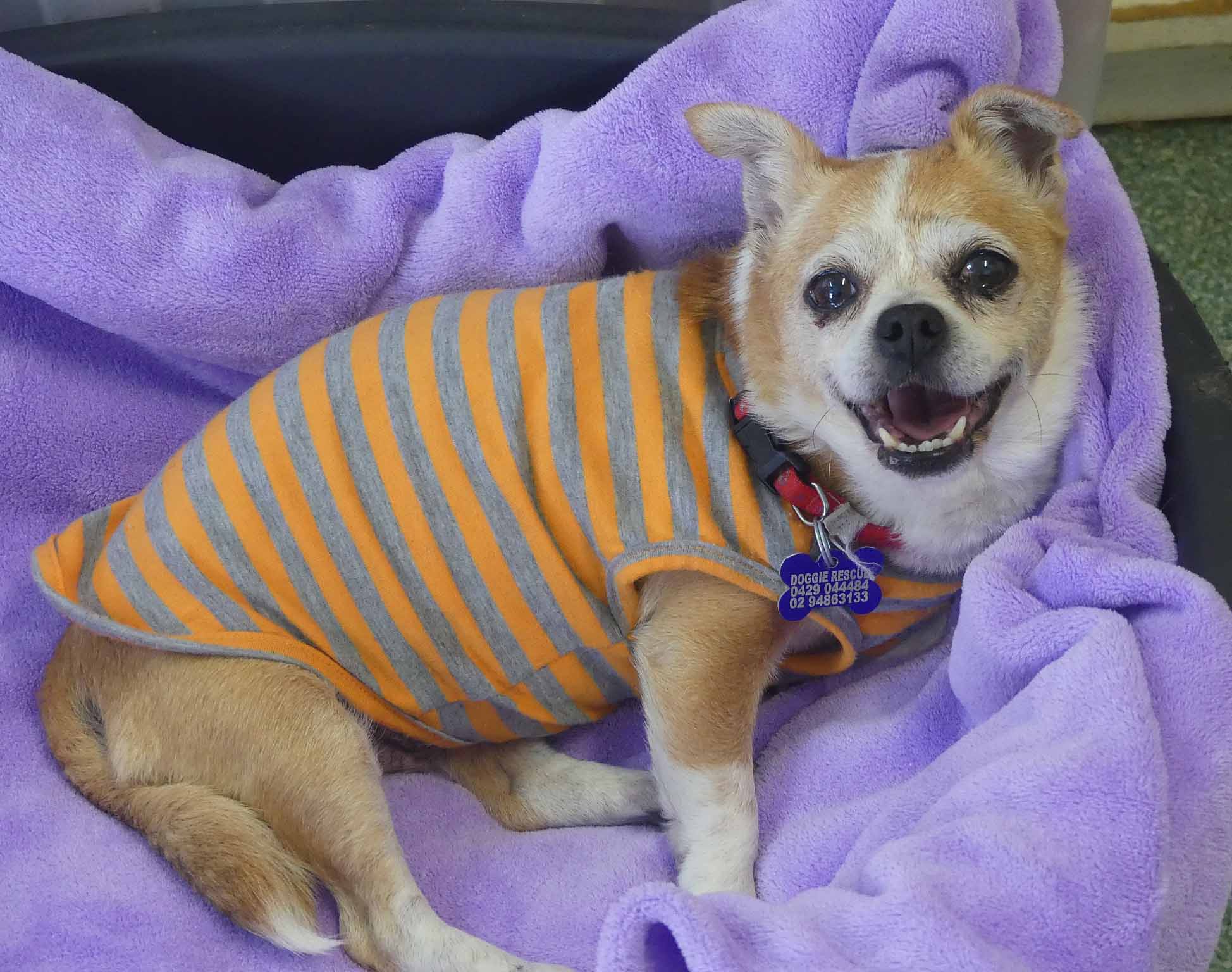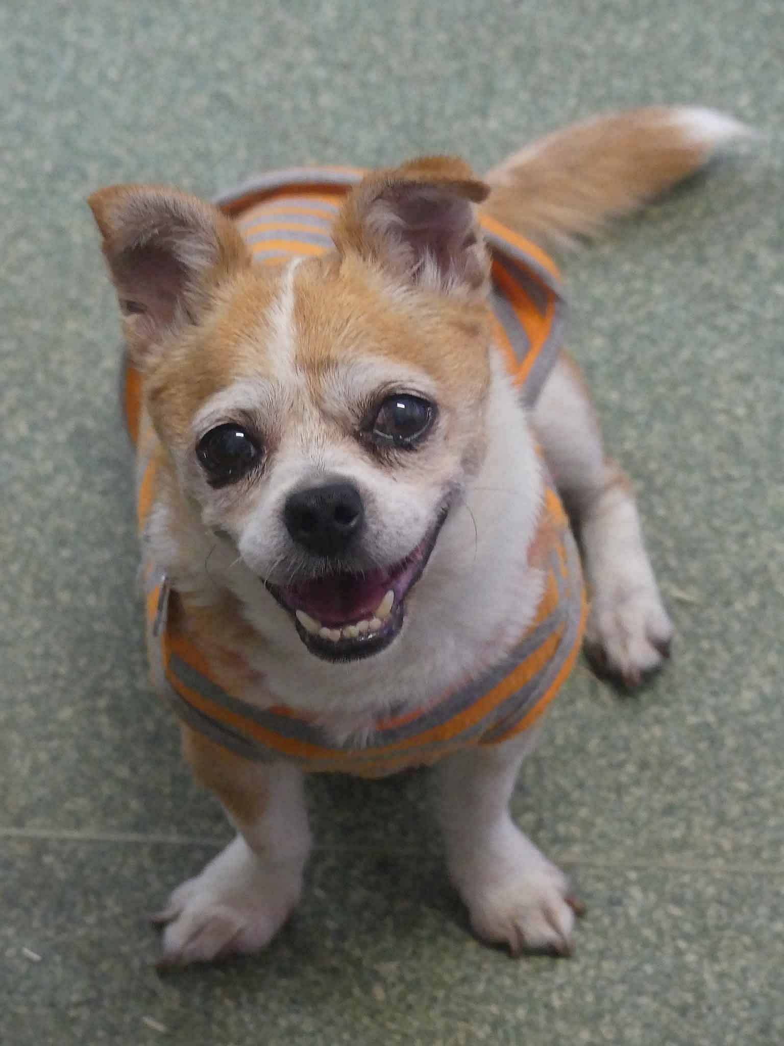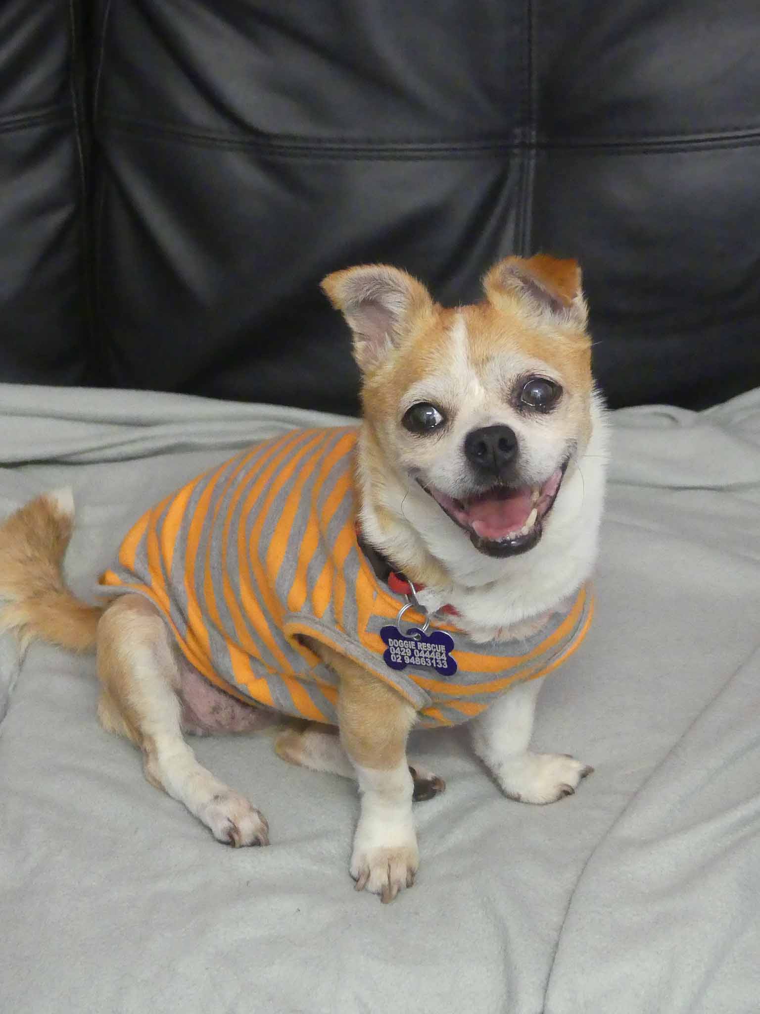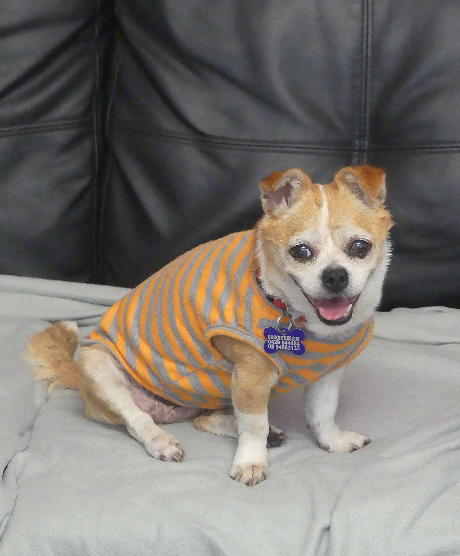 Sweet Twinkle is such a happy easy girl. She has come from the pound in poor condition, and we are slowly working through her list of medical issues. She has bilateral inguinal hernias, bad teeth and a few skin lumps. Our vets have just diagnosed her as being diabetic so she is being stabilised before we proceed with any of her medical issues. She is social with other small dogs. She has a hearty appetite and is currently on 2 meals a day of soft, cooked chicken, rice and veggies. She has a short coat and came in weighing 3.9kg.