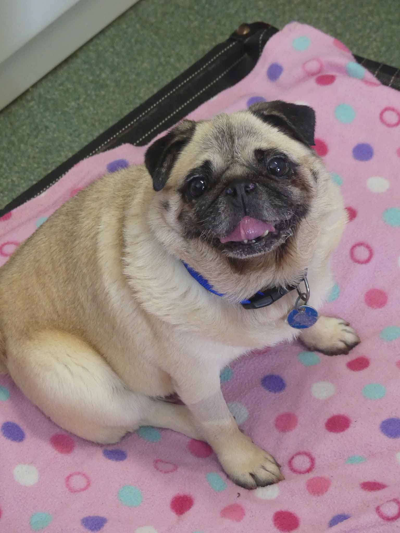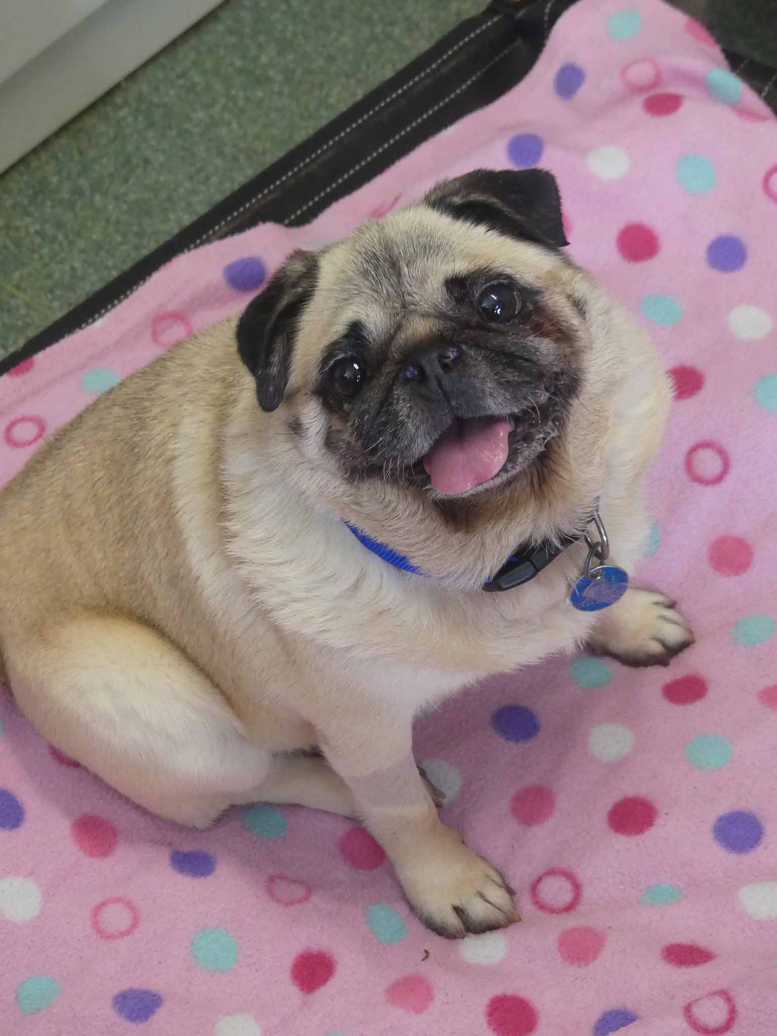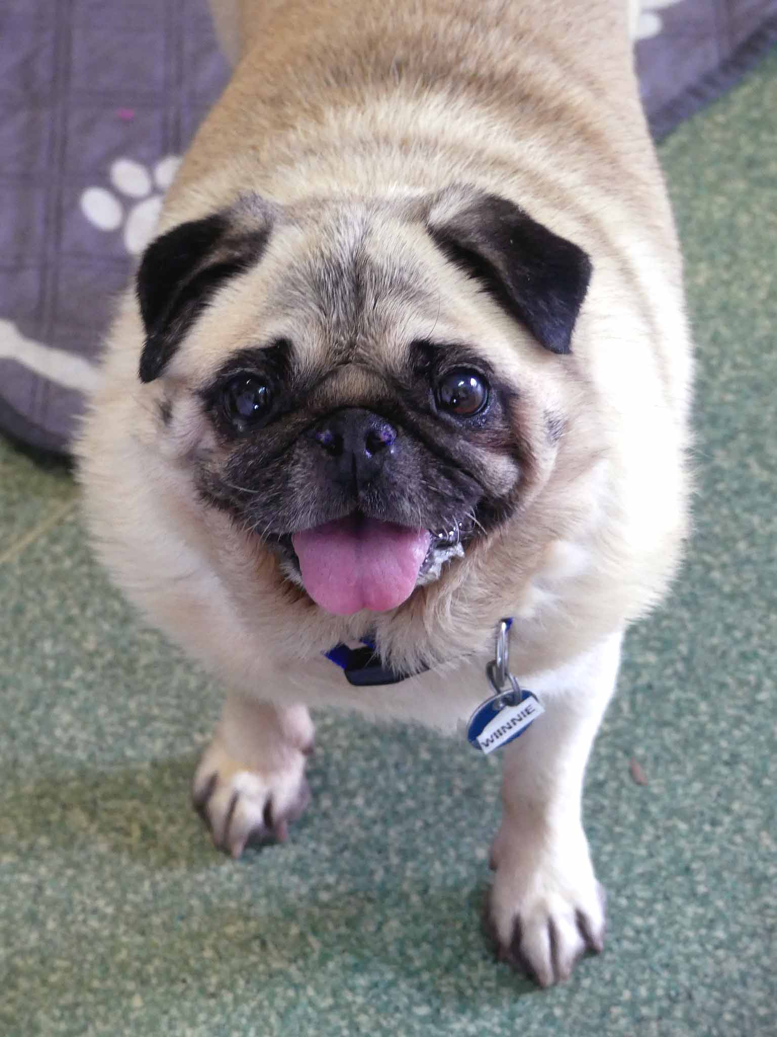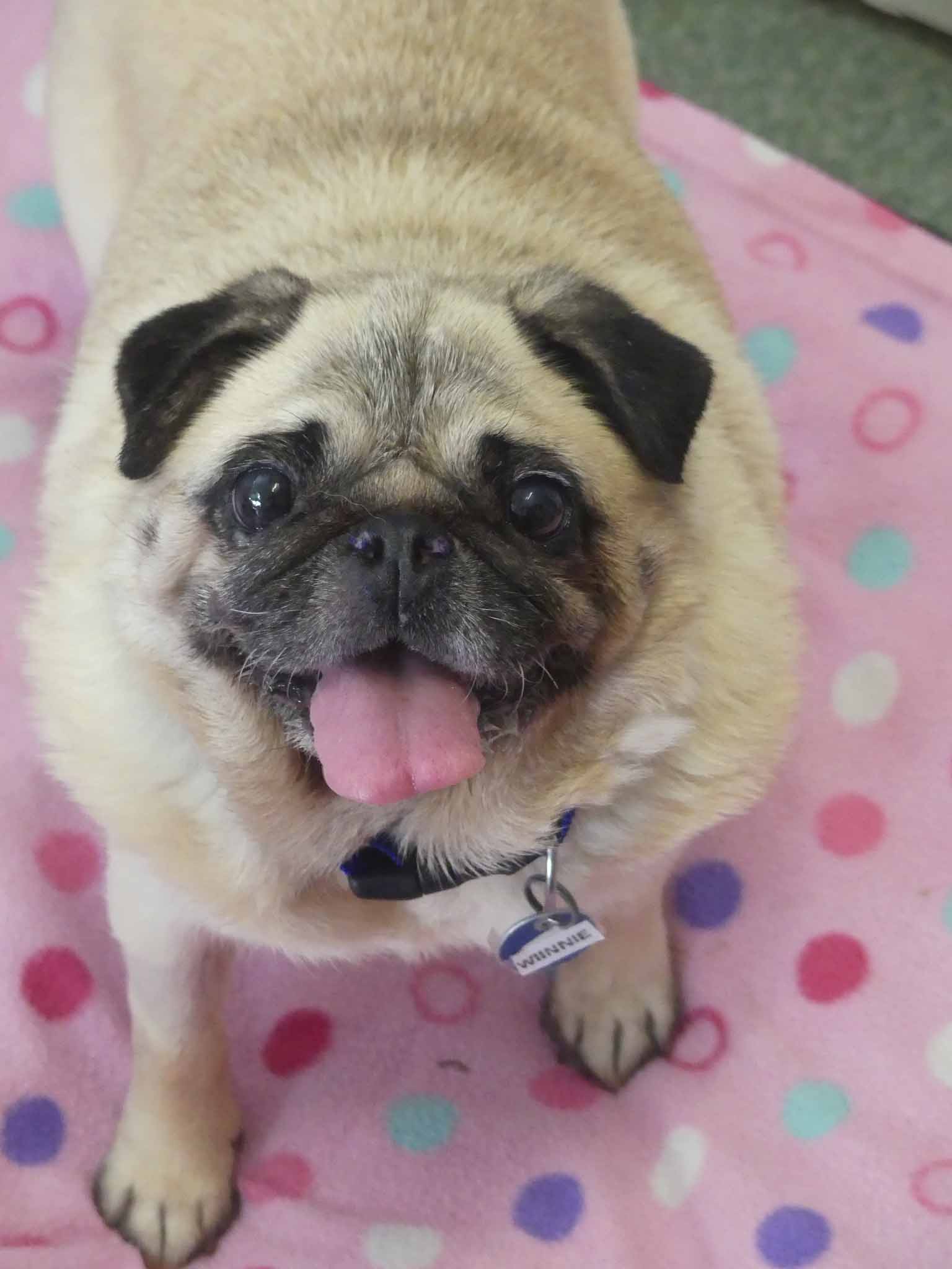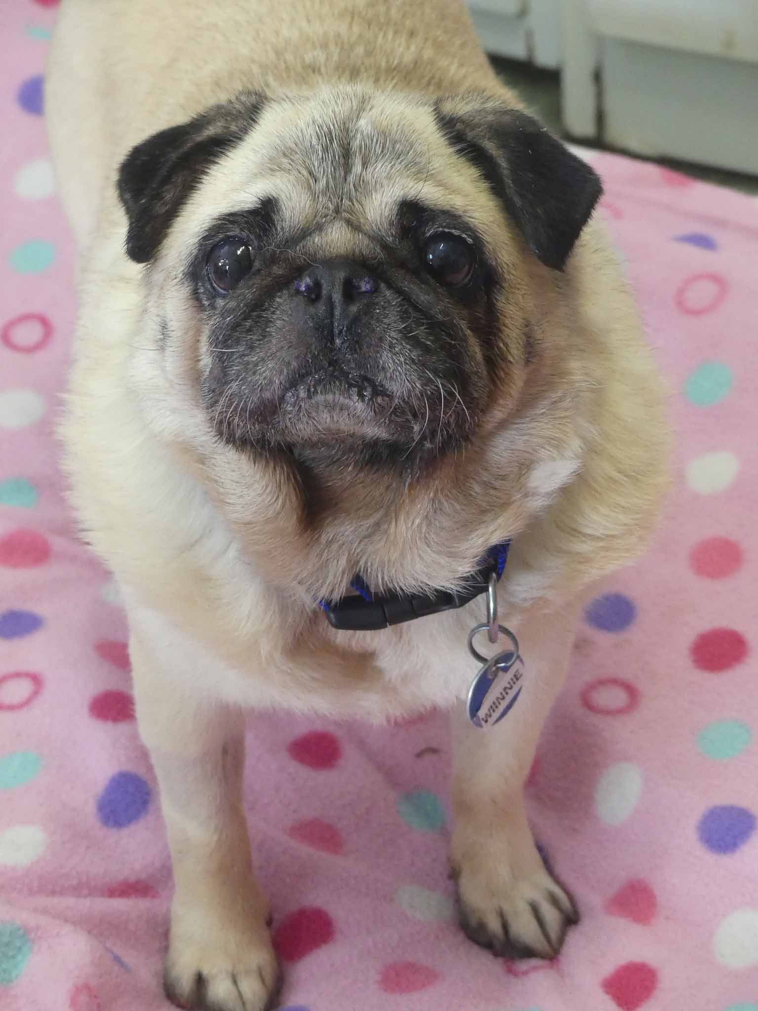 Winnie is a little sweetheart who was left at the pound in very poor condition. Winnie has the typical Pug issues and needed BOAS surgery to improve her ability to breathe. Her skin was inflamed and her ears were infected and she has severe dental disease. We have been working on the ears and skin, and she has recovered well from BOAS surgery. She is affectionate with people and social with other small dogs. She is overweight coming in at 8.2kg and has a short coat.